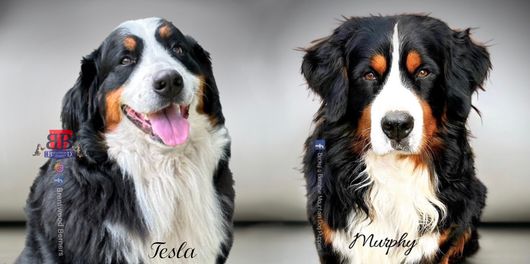 Our Bernedoodle puppies are black and white. Bernese Mountain Dog puppies are black rust and white. Colors will vary depending on the parent dogs.