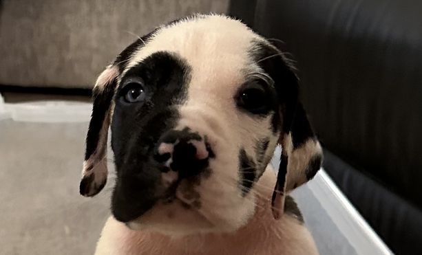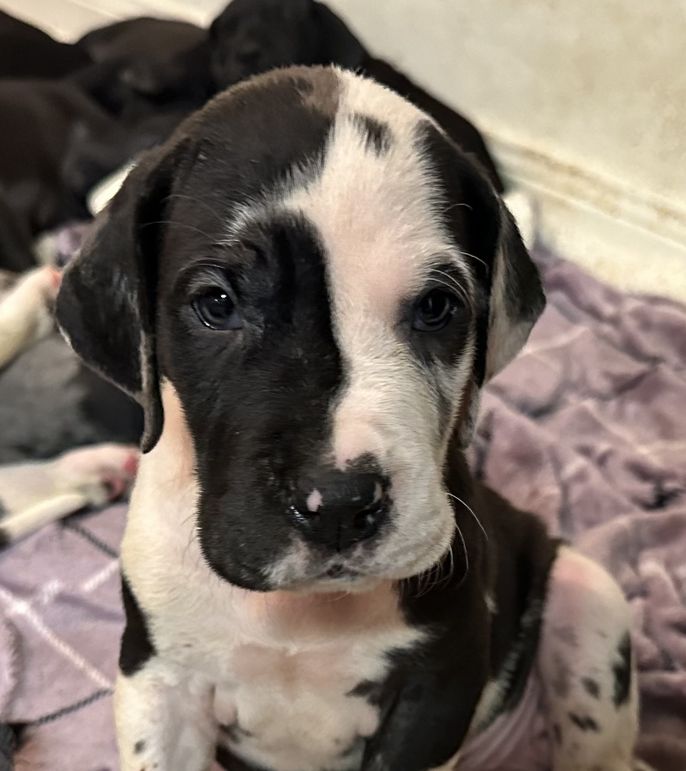 Our puppies include blue brindle, blue and white, brindle, fawn, blue, harlequin, merle, and black. Colors will vary depending on the parent dogs.