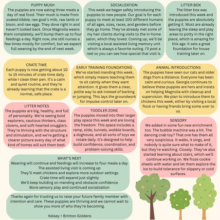 I tell anyone I meet about how great Brinton Goldens is! Kelsey and her husband were amazing. During the process of adoption they were responsive and provided a ton of information to help me get ready for my puppy’s arrival. In addition, my puppy Viviana came to me crate trained and potty trained, which made our first week together way easier than I could’ve ever imagined. They also provided several items to help her get settled with me (ex., food, snuggle puppy, blanket with moms sent, toys, treats). Not only that but her paperwork came with a guide with incredibly helpful information on raising a puppy. Honestly would recommend them to anyone! If Viviana needs a sibling in the future I’m reaching out to Kelsey!