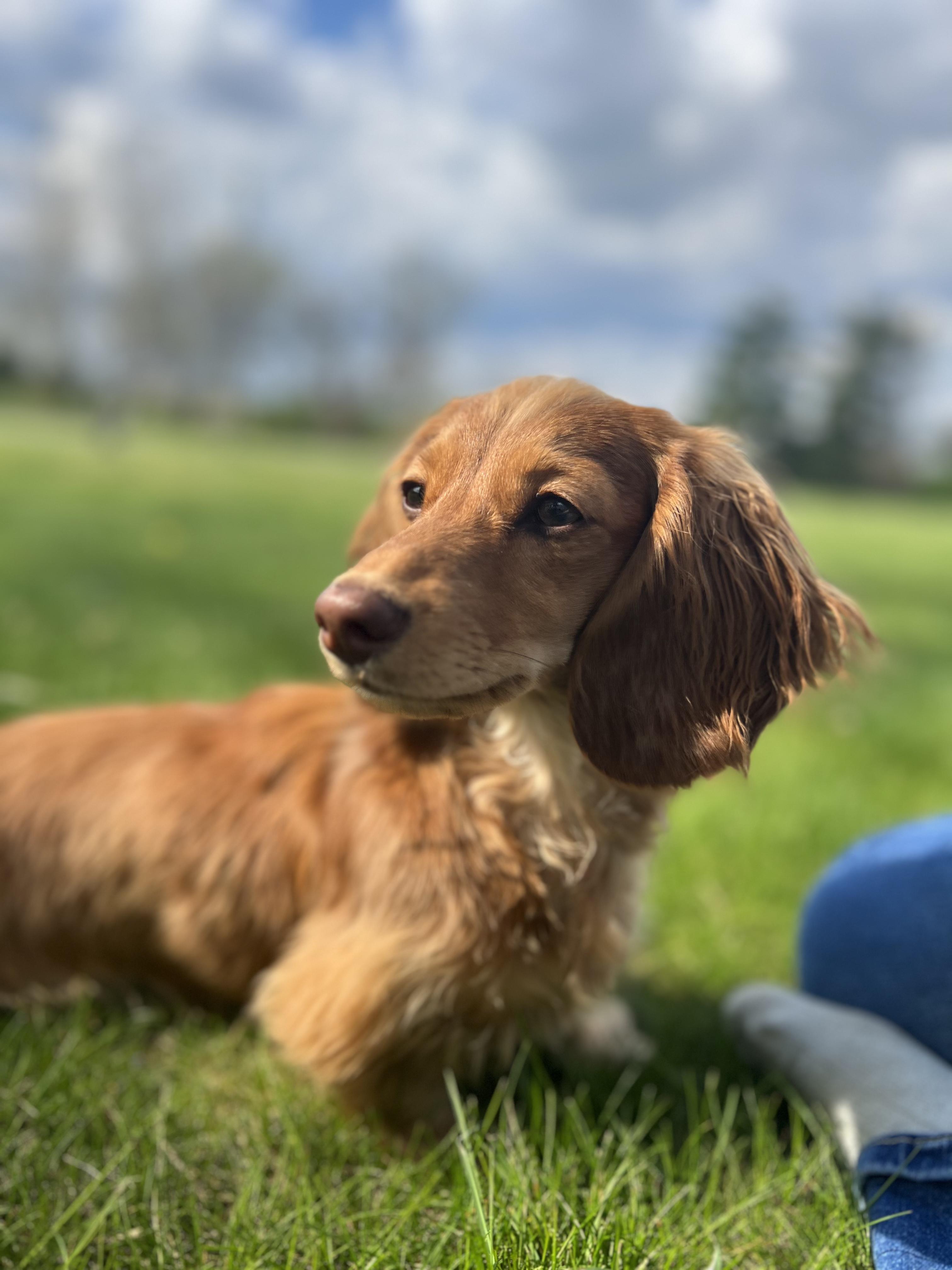 Molly is a female Dachshund. Carefully selected as a great representative of her breed, Tina decided to make her part of their program. Tina has passed Good Dog’s screening process, which involved a review of their breeding practices, environment, and the mental and physical health of their dogs.