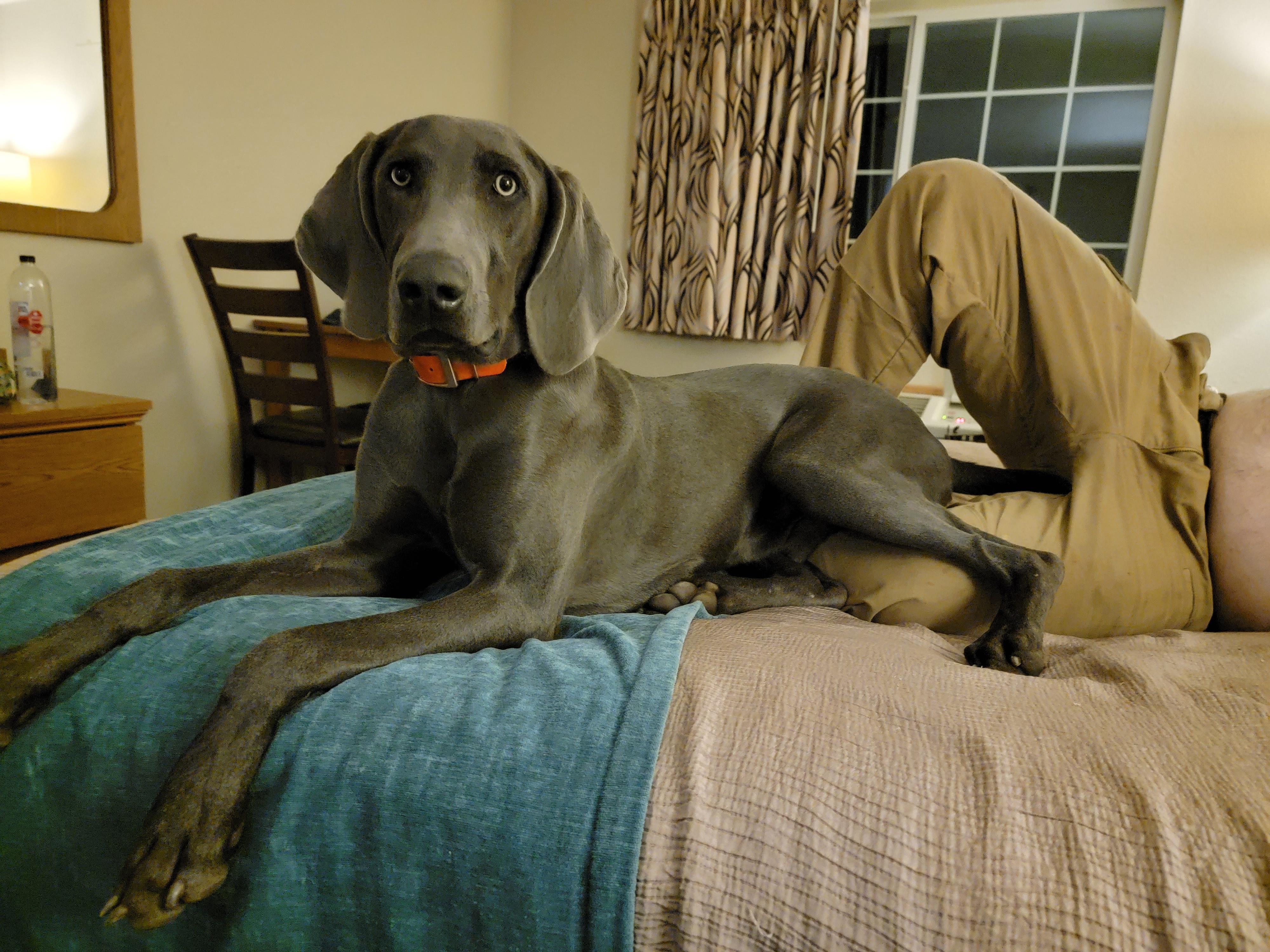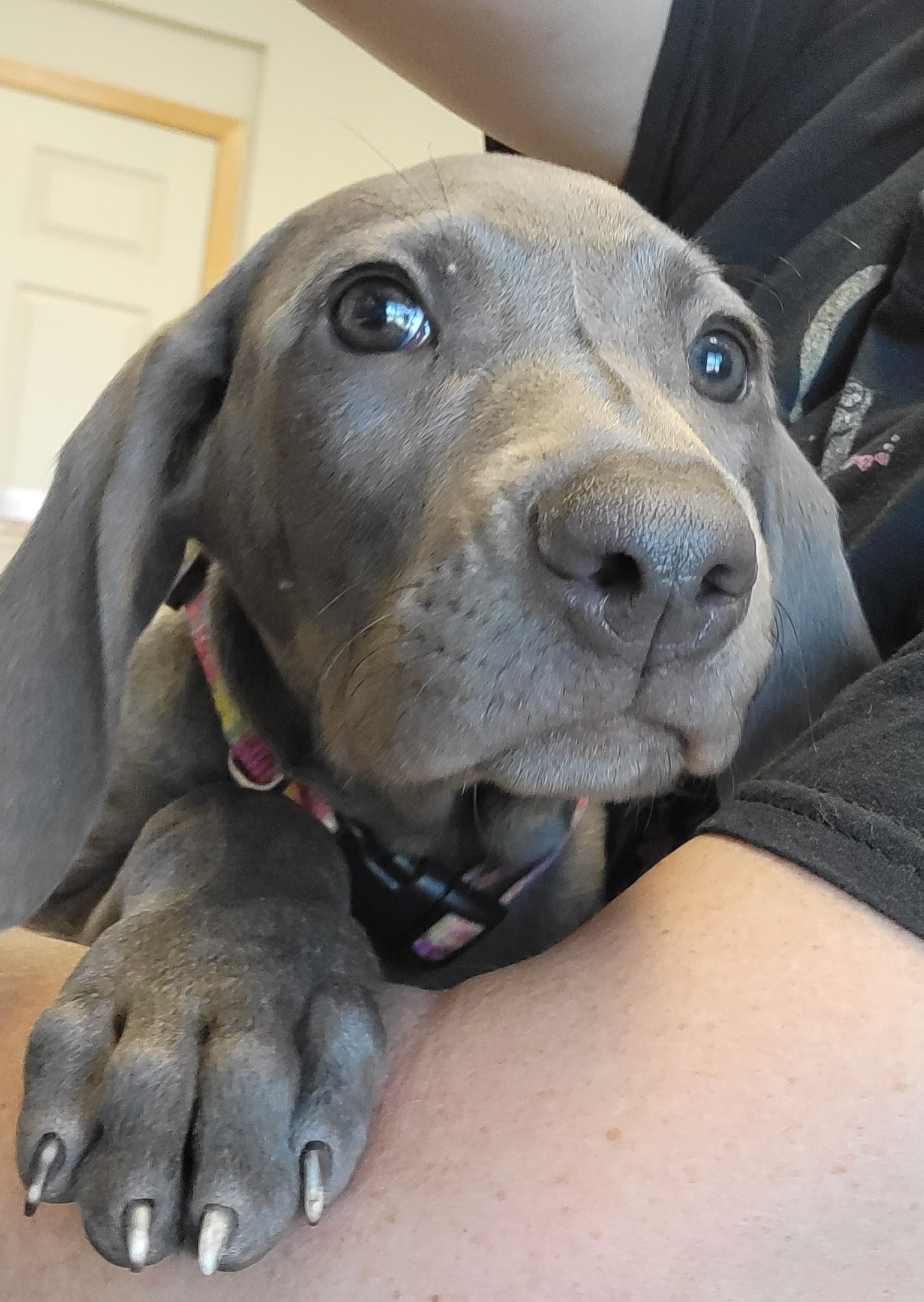 Nym is a female Weimaraner. Carefully selected as a great representative of her breed, Sara decided to make her part of their program. Sara has passed Good Dog’s screening process, which involved a review of their breeding practices, environment, and the mental and physical health of their dogs.