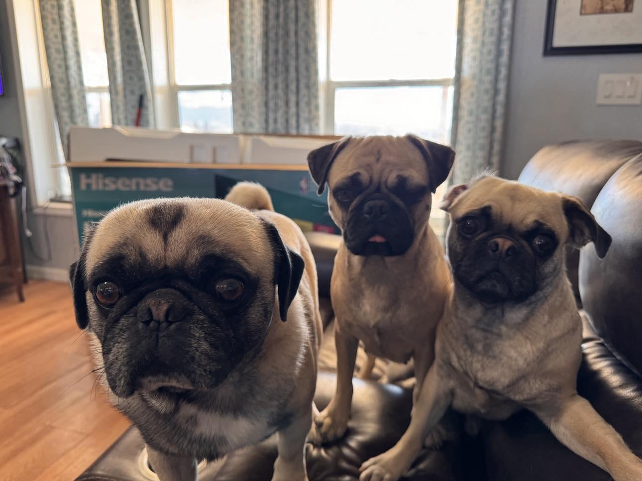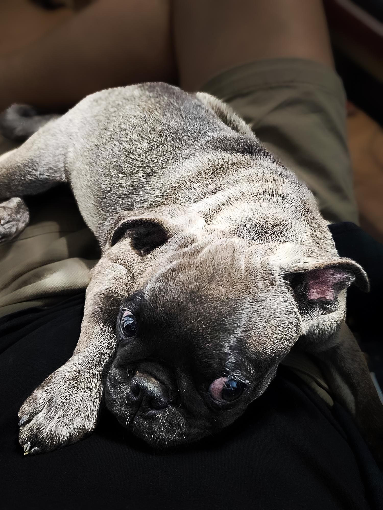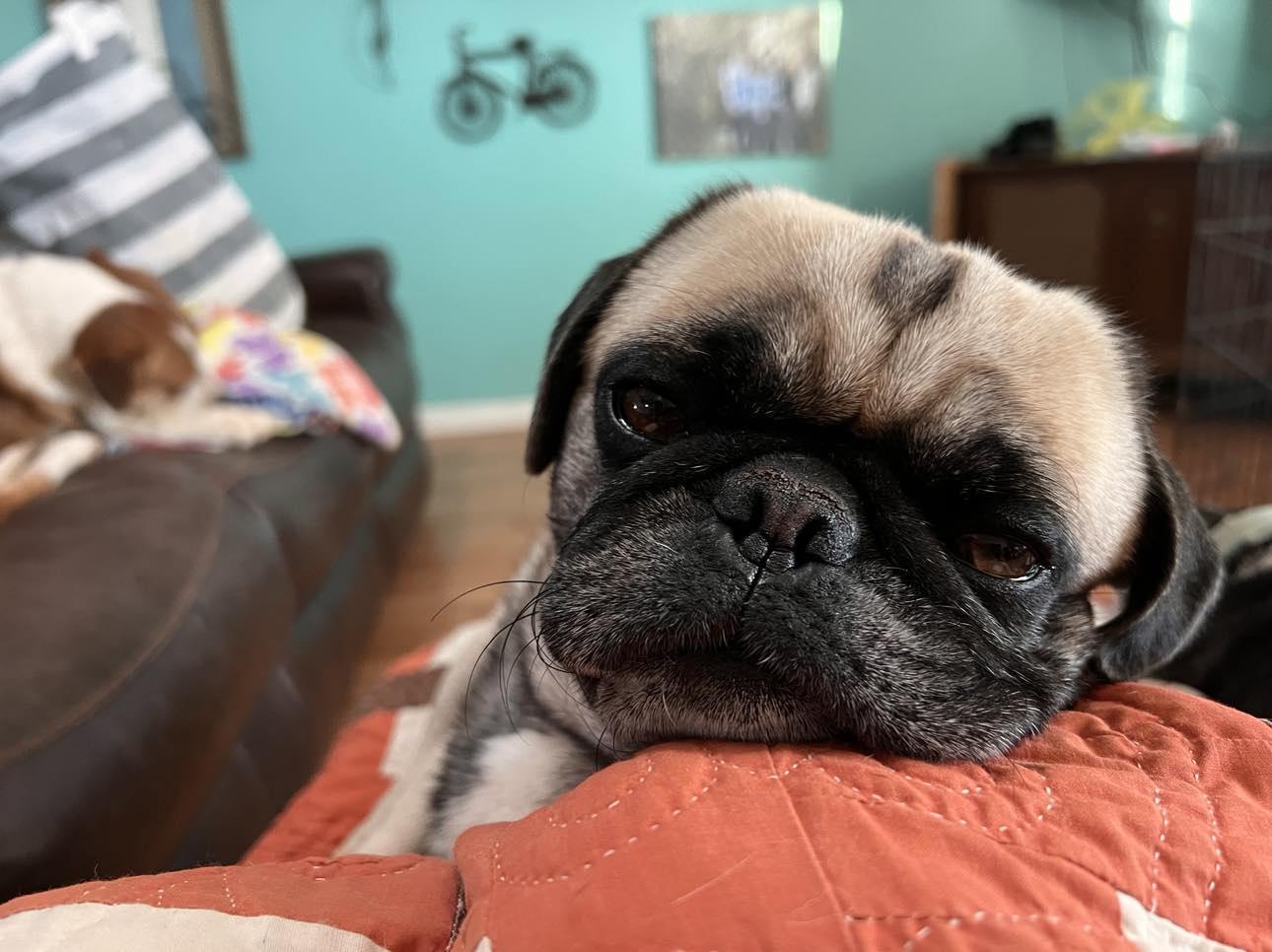 A troublemaker 😍. Our friends, pug and cane corso breeders, traded my Photography and Marketing services for our first pug Theodore. We fell in love. They asked if we would want to work together as breeders. We started with our beautiful Liza having her retirement litter. I was hooked and in love with the process from delivery to home placement. There is nothing like it or owning a pug!