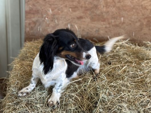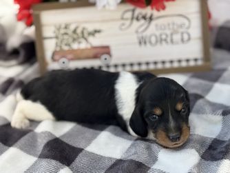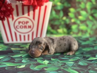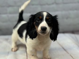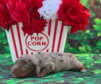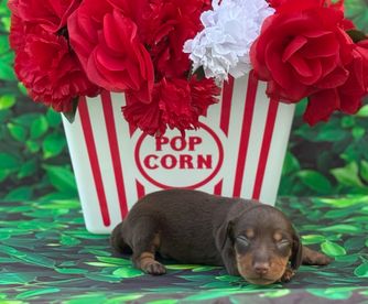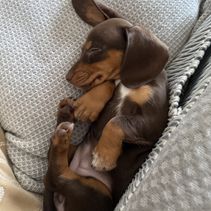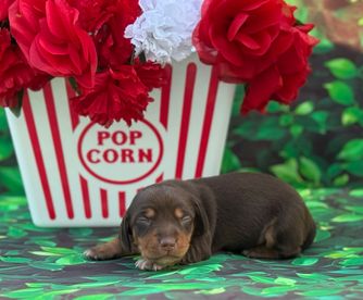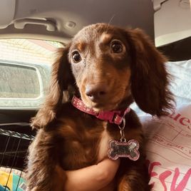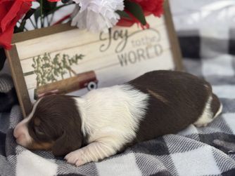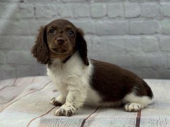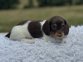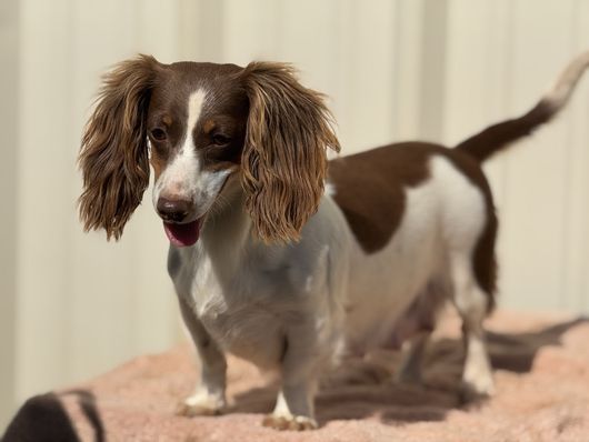 Sweetie has the perfect name for her because that is exactly what she is: a sweetheart! She is the perfect petite weenie dog. She is a AKC registered long hair chocolate and tan piebald.