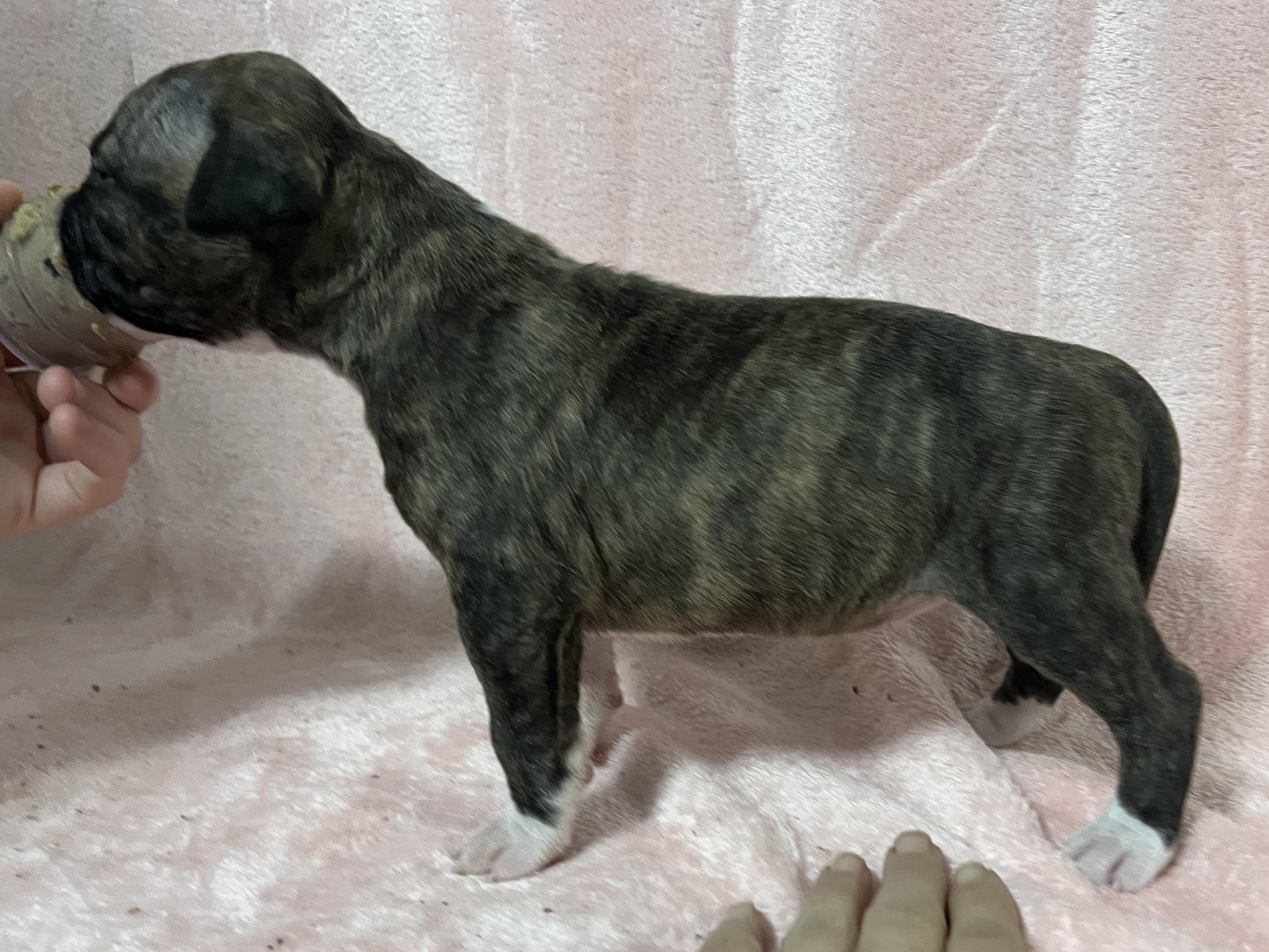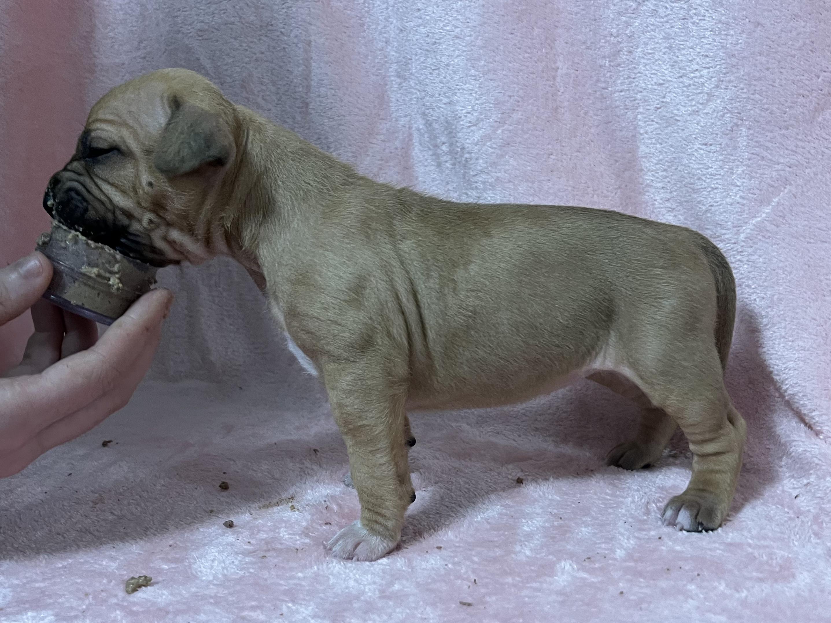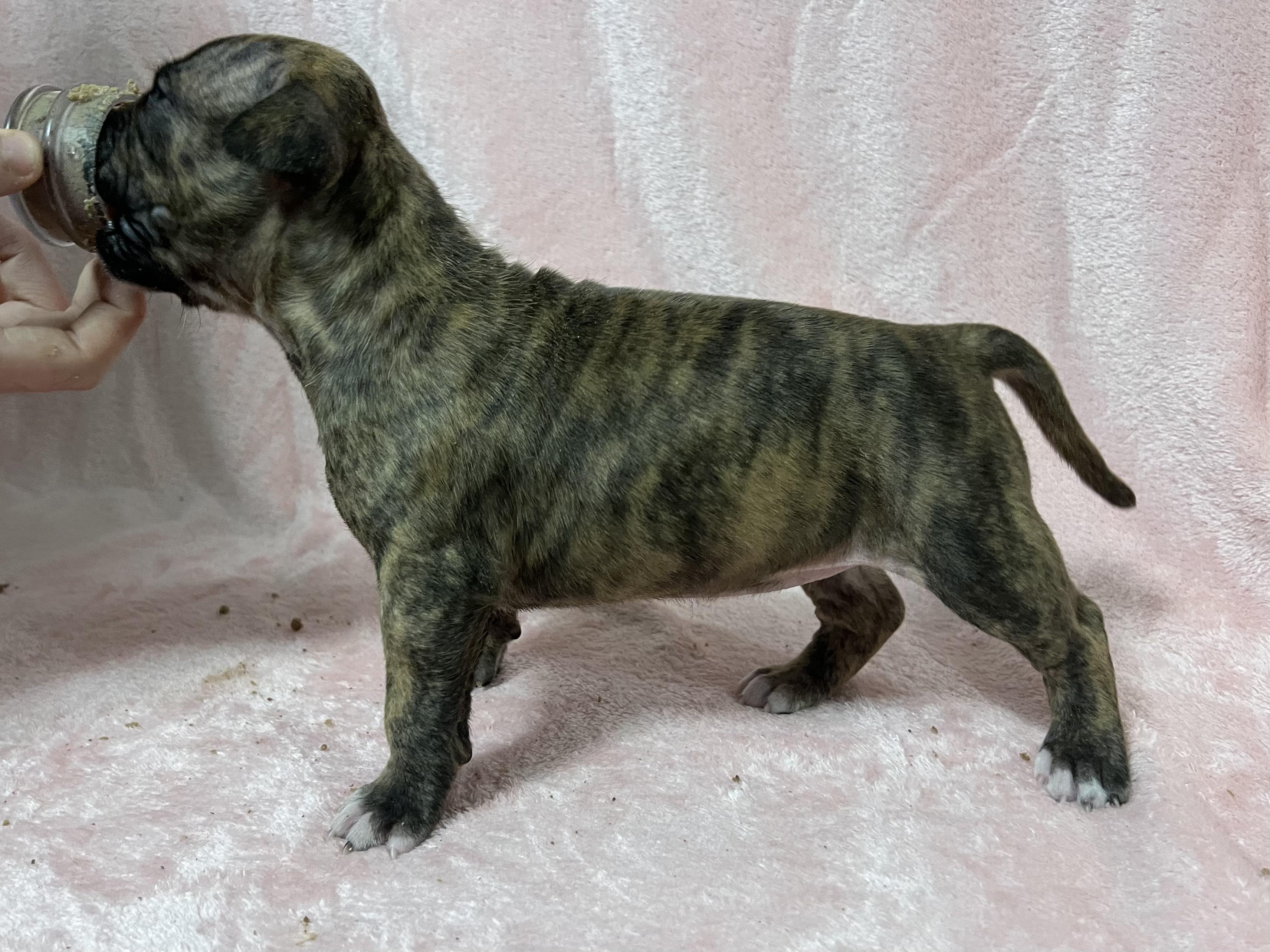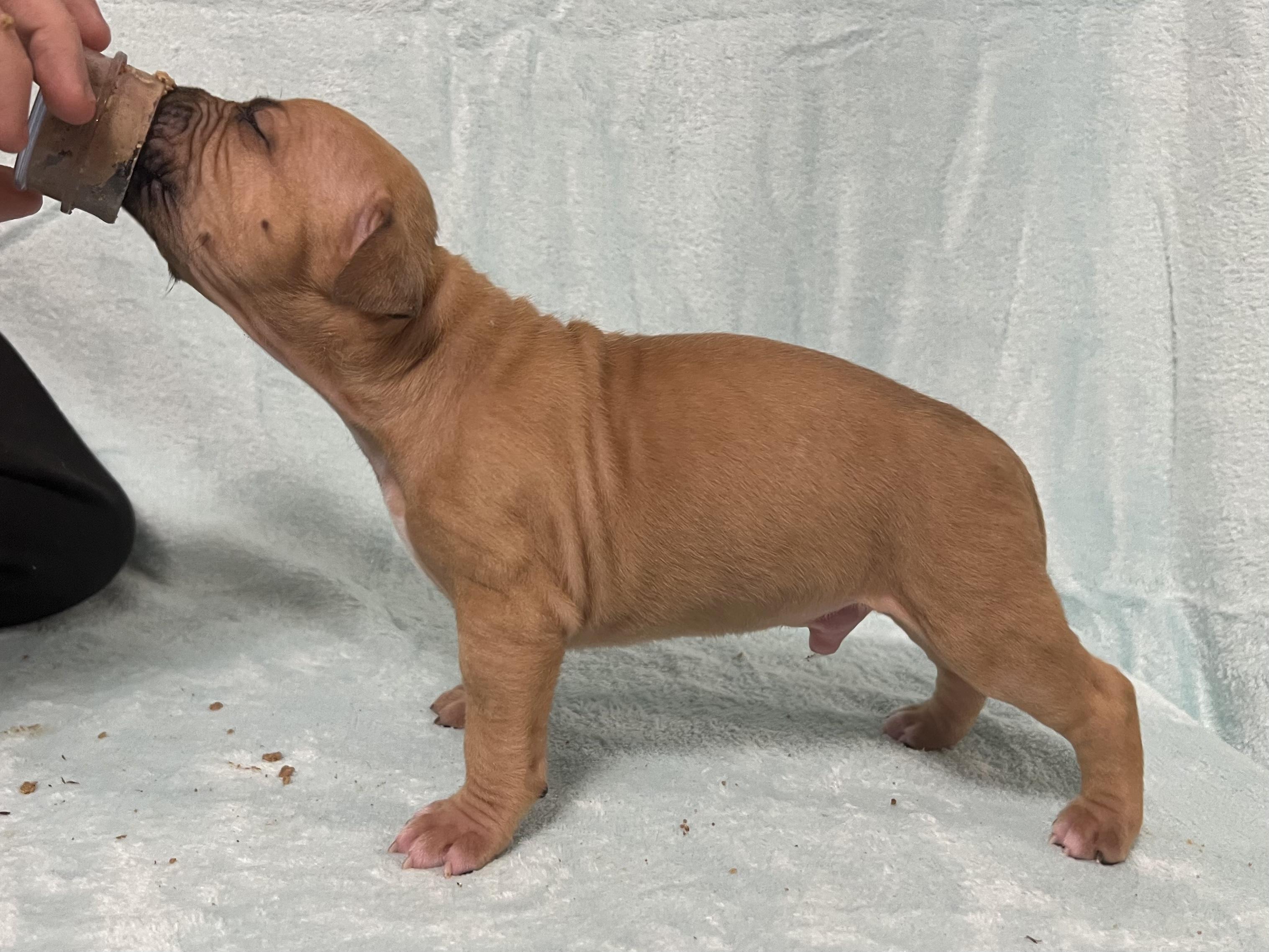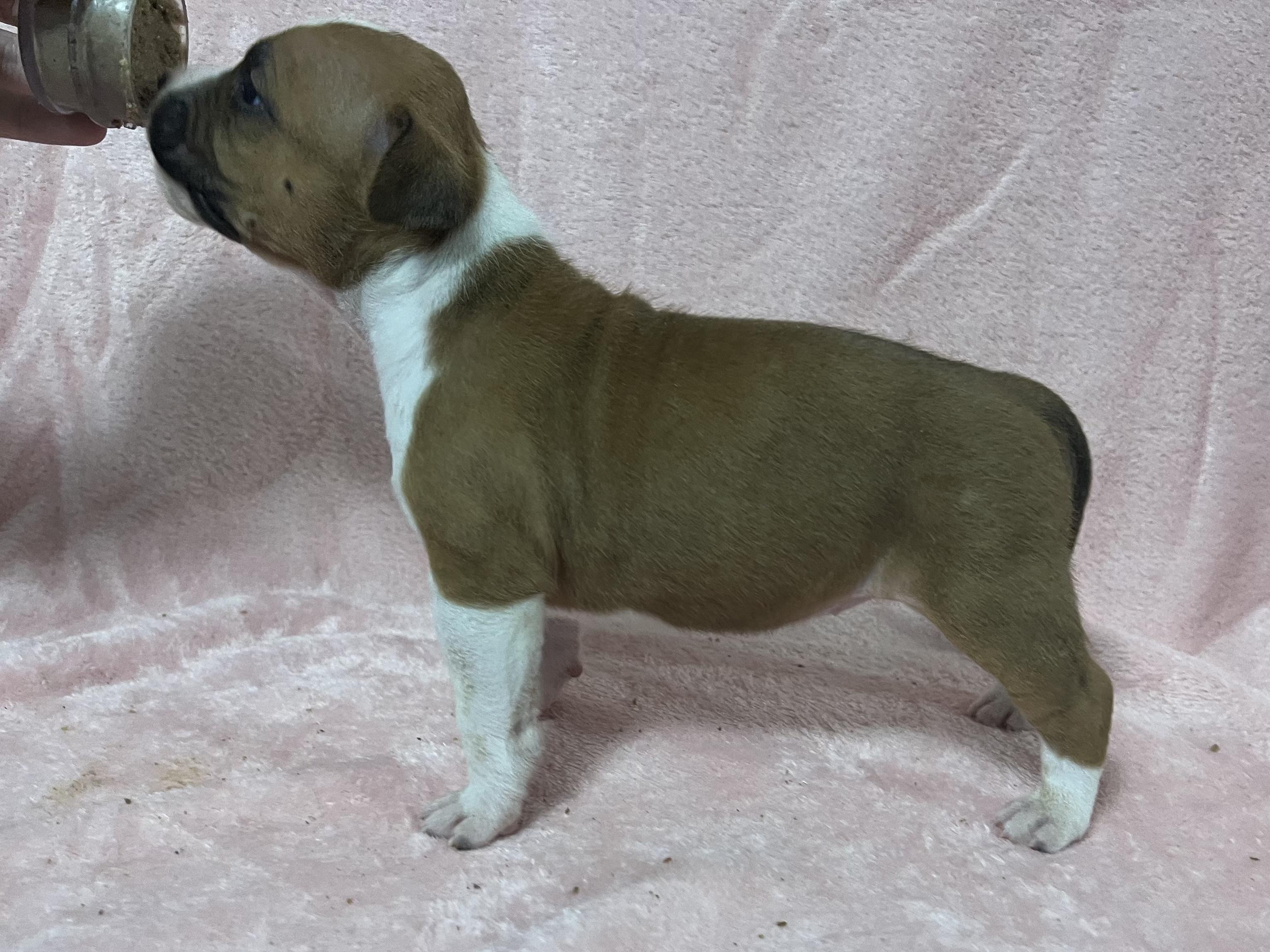 Our Boerboel puppies are red. American Staffordshire Terrier puppies are fawn. Colors will vary depending on the parent dogs.