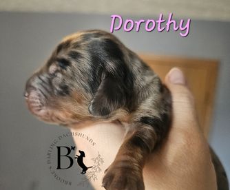 After almost being scammed 3 separate times via Facebook, I felt defeated. I was ready to call it quits on my Doxie search but thankfully I decided to take one last look on the app called Good Dog. There I came across Brooke’s “Golden Girl’s” litter. The moment I saw little Dorothy, I knew she was meant to be mine. I wrote Brooke immediately. I felt the best vibes from our very first conversation. The next day we booked a flight. Over the next almost 2 months, I messaged Brooke often. She kindly answered all of my one million questions and shared her experiences and advice. I could tell how much she loves her Doxies and I felt so lucky to be adding one to our family. She kept us up to date on Dorothy’s milestones, as well as pictures and videos. She went above and beyond to make sure Dorothy’s trip home was smooth with the airport requirements.