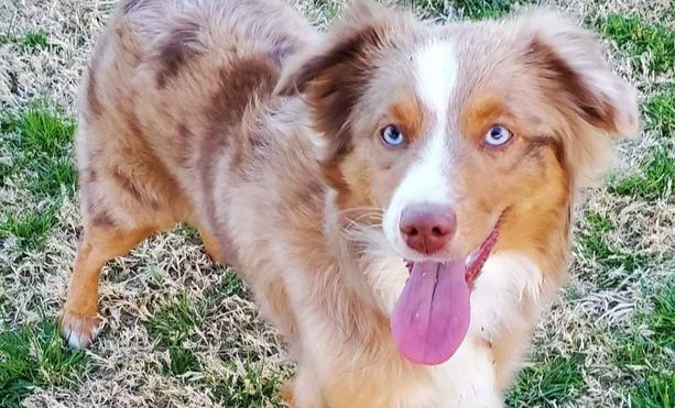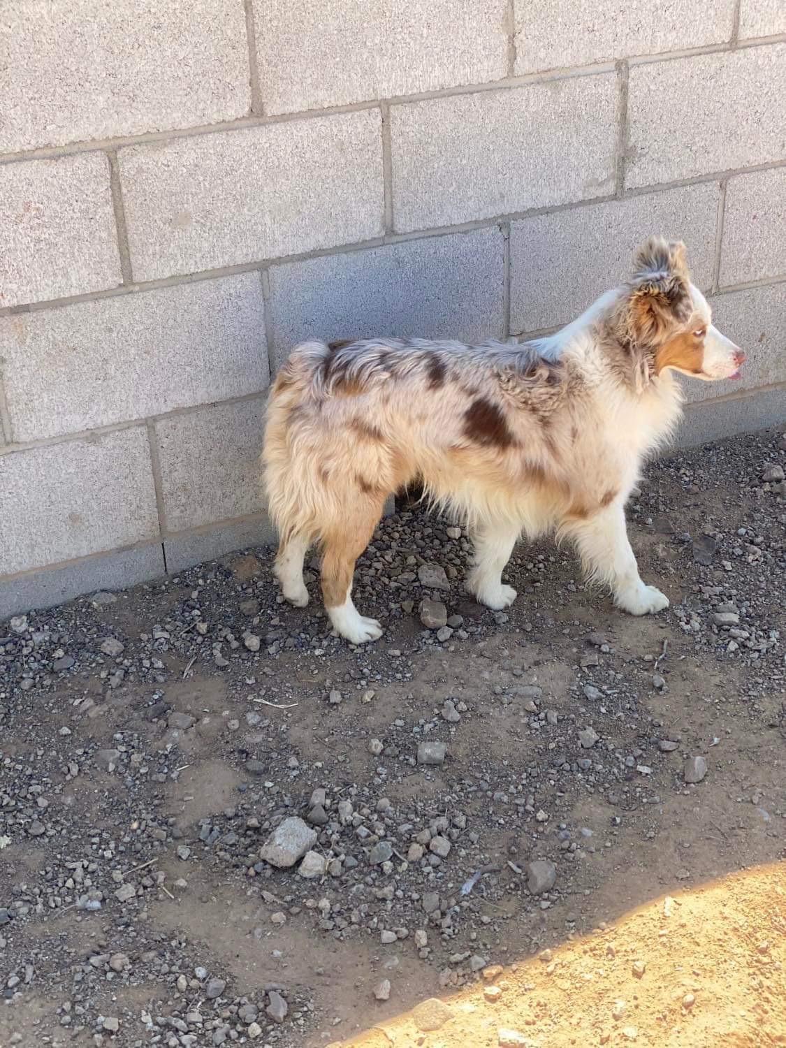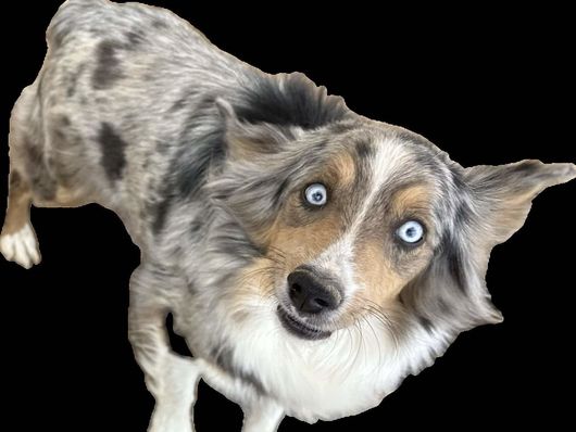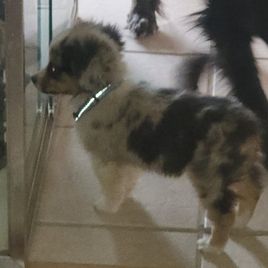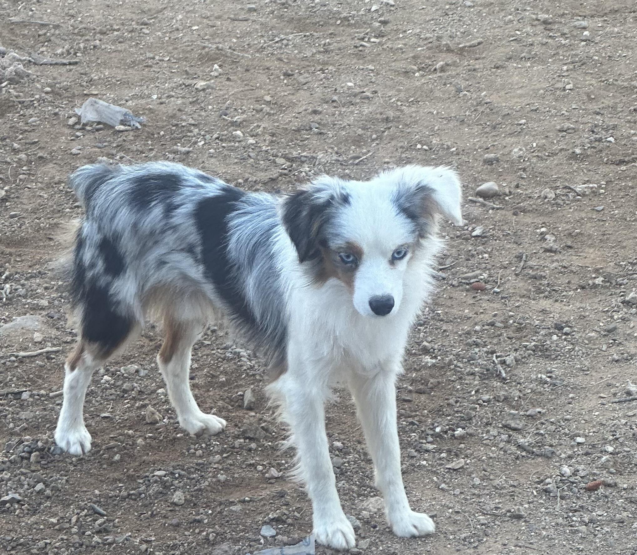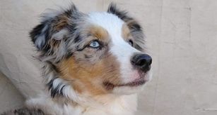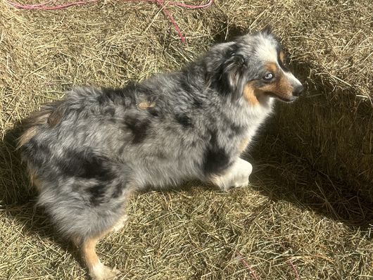 blue merle male, docked tail, with two blue eyes.