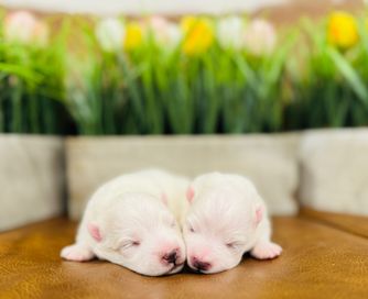 Our puppies include white and biscuit and white. Colors will vary depending on the parent dogs.