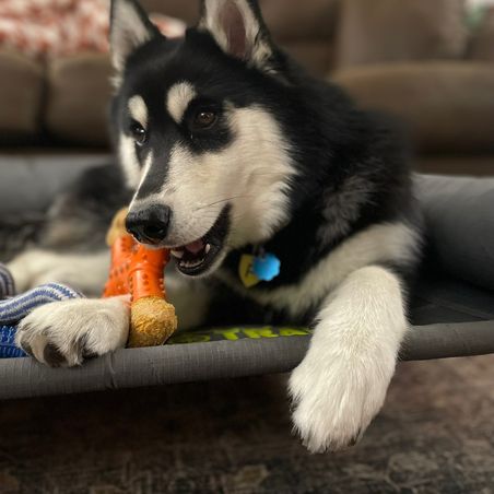 Neeko is an Agouti Wolf Gray Siberian Husky. He comes from champion bloodlines. He has an incredibly calm and majestic and stoic temperament. Which matches his incredible color and markings.