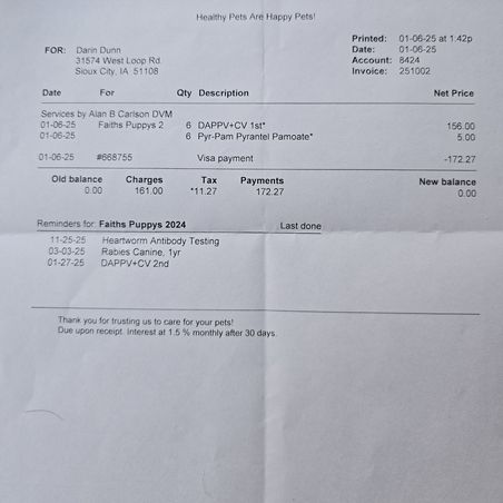 Darin may provide a written contract or health guarantee when you purchase a puppy. This helps protect both you and your breeder, ensuring that you both have a clear understanding of the terms of your puppy purchase. If Darin offers a contract or guarantee, the details will be personalized by them. If you have any questions or want to know more, don’t hesitate to reach out to Darin directly.
