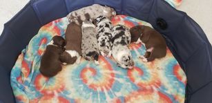 Our puppies include blue merle, red merle, red, and black. Colors will vary depending on the parent dogs.