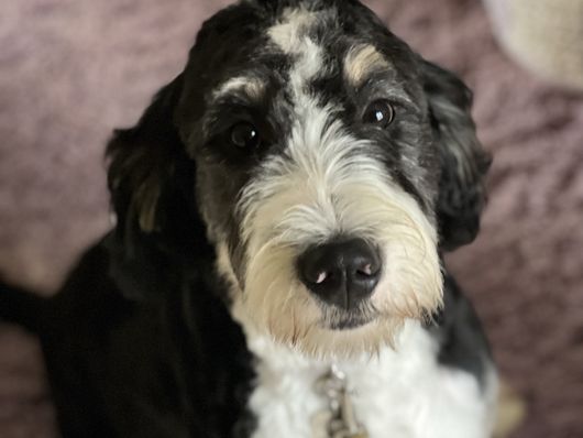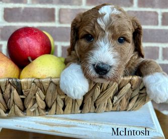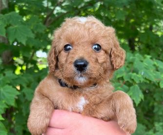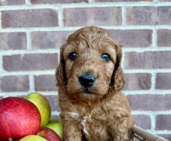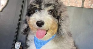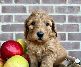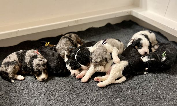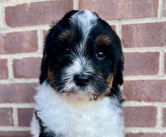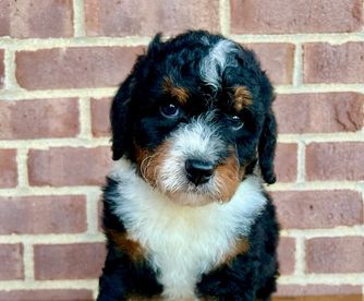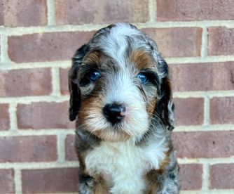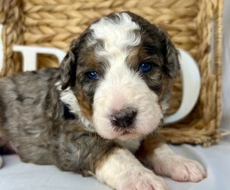 Our Bernedoodle puppies include tri-color and merle. Goldendoodle puppies include apricot and red. Colors will vary depending on the parent dogs.