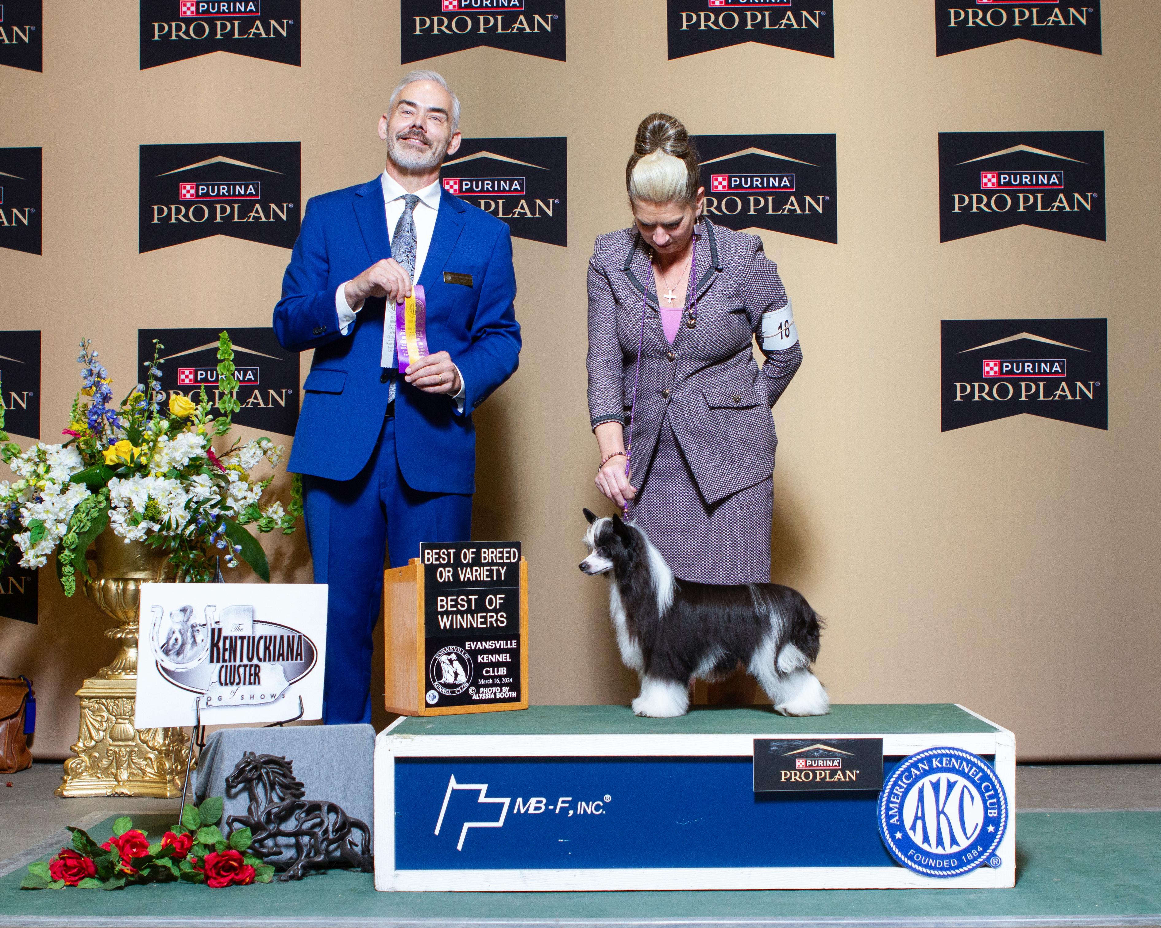 I showed horses all of my life and as I got older horses became more difficult, so I started showing dogs. I started in Miniature poodles and still love the breed but have also added Chinese Cresteds and Russian Toys to my family. I needed a breed that was a little more wash and wear than a poodle to move forward with.