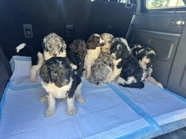 Robyn was so responsive and knowledgeable about the golden doodle breed dog. She explained how it is the second generation dog which is a 75% poodle and 25% golden retriever. The sire was a white standard poodle and the dame was a 50/50 mix of golden retriever and a standard poodle. My desire was to find a parti mix color and the puppies on her site were beautiful. She explained to me that the puppies slept together in a metal cage at night and when she woke them up at 7, she fed them puppy food and gave them water. She then allowed the puppies to be with mom and dad in a fenced in back yard. I was very pleased to know that my puppy could make it through the nite without an accident. Puppies are like small babies and learn to sleep at night but during the day, they have no concept of when to urinate and make a bowel movement. Doug and I had planned to have our puppy crated but that lasted about ten minutes and then she was in the bed with us to sleep! This worked out nicely for us and gives great comfort. We are 100% golden doodle lovers! Robyn stayed in touch with me via smart phone sending frequent pictures and videos of how active our puppy was outside. I saw that Luna (as we decided to name her) appeared to be a well adjusted puppy so I had no worries about taking her as a new puppy for our home. We had recently lost a black F1b golden doodle and we were in mourning after losing her and wanted a dog in our home.