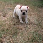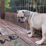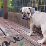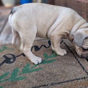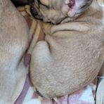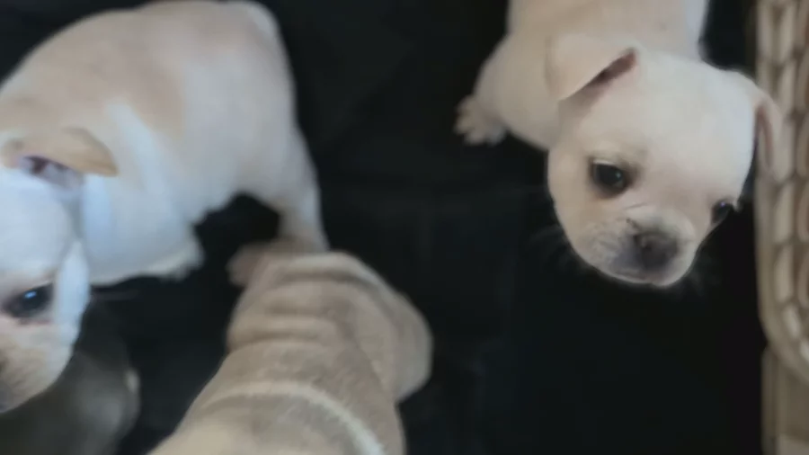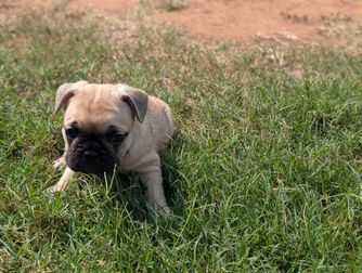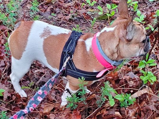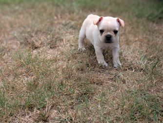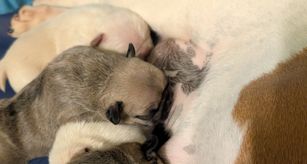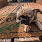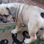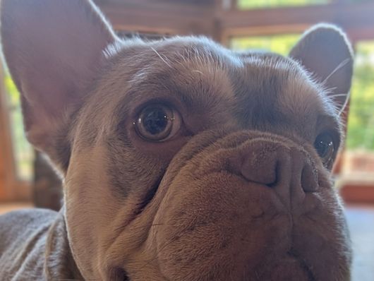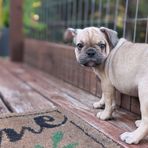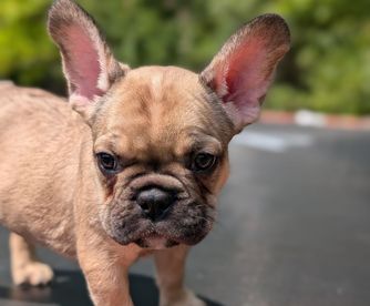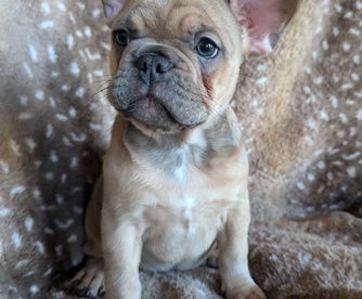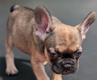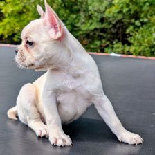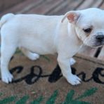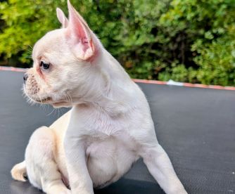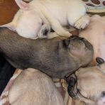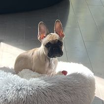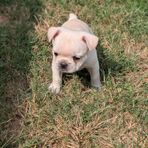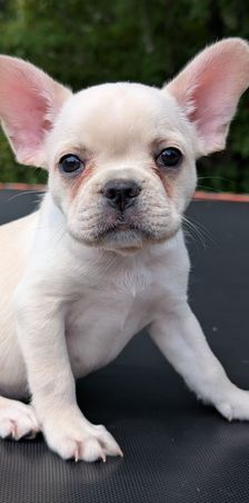 Rosie is the absolute sweetest little girl! She is my snuggle bug and has been an amazing Mom! She is AKC registered as white and fawn piebald. She also had her puppies naturally! Which is rare for Frenchies. She's a wonderful little companion and we just love her to pieces.