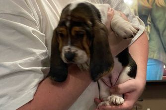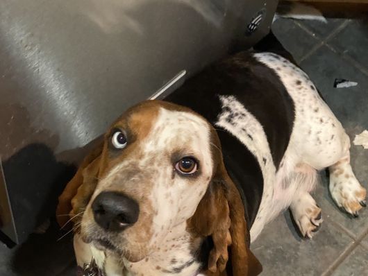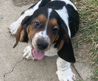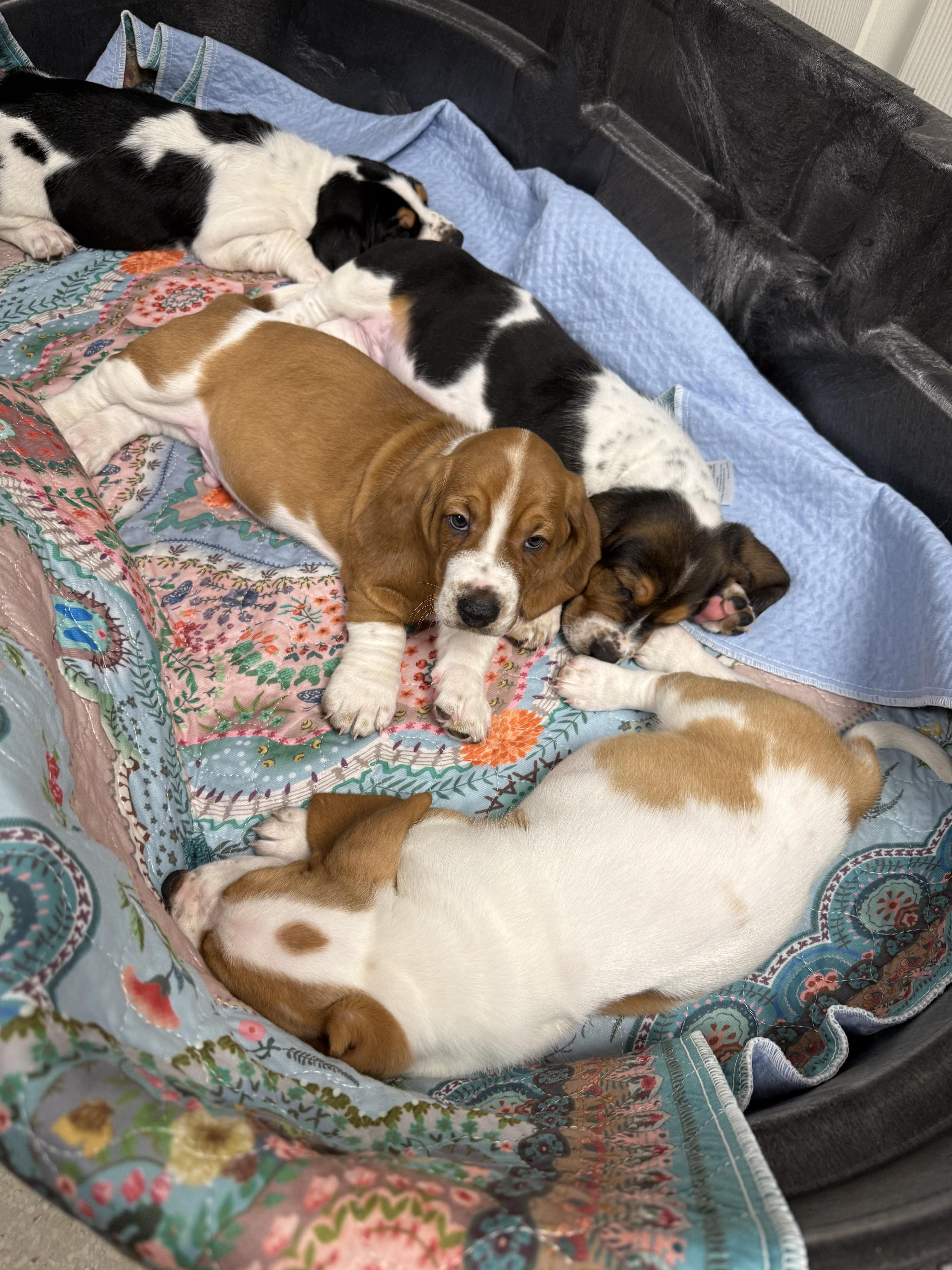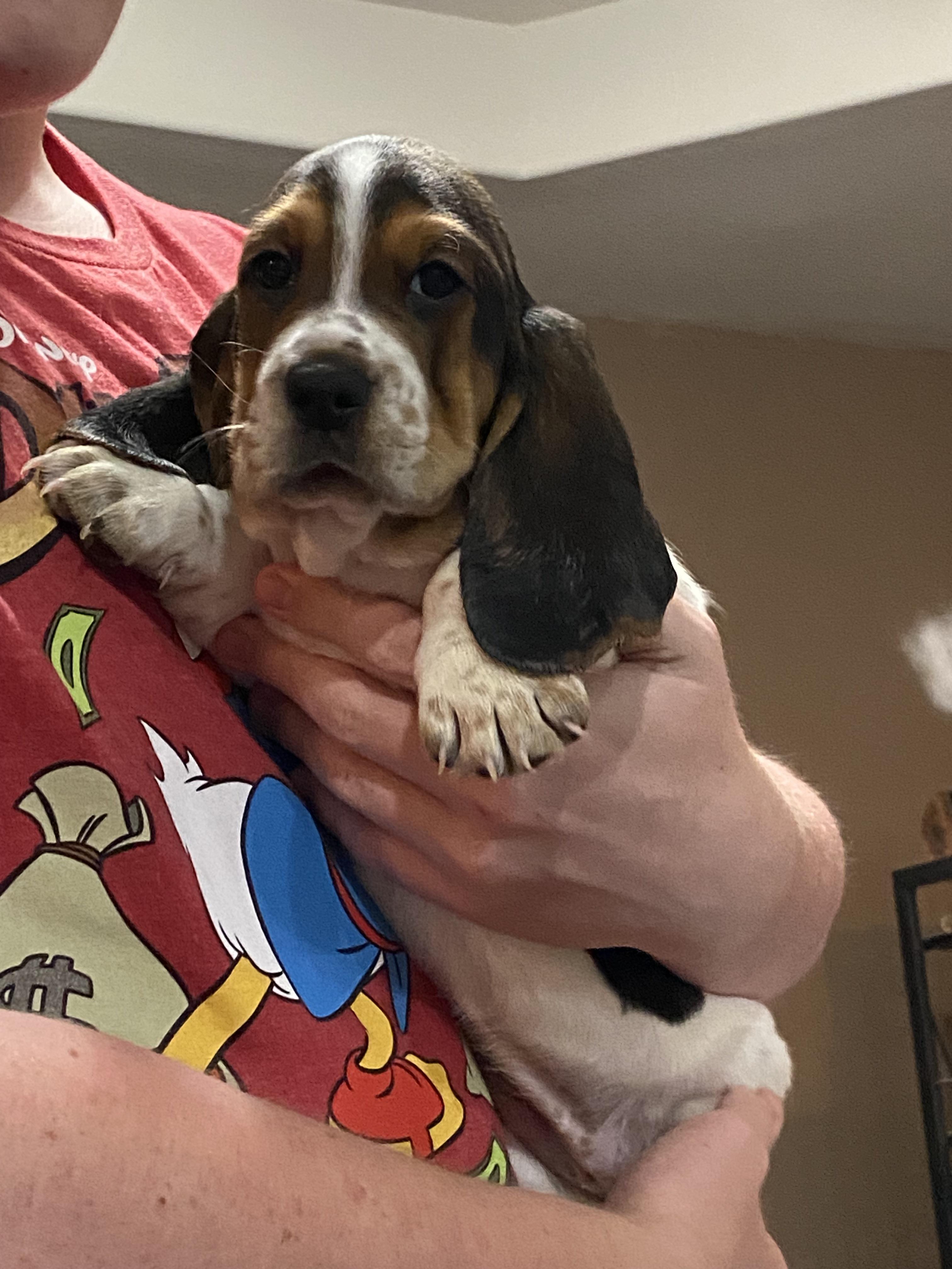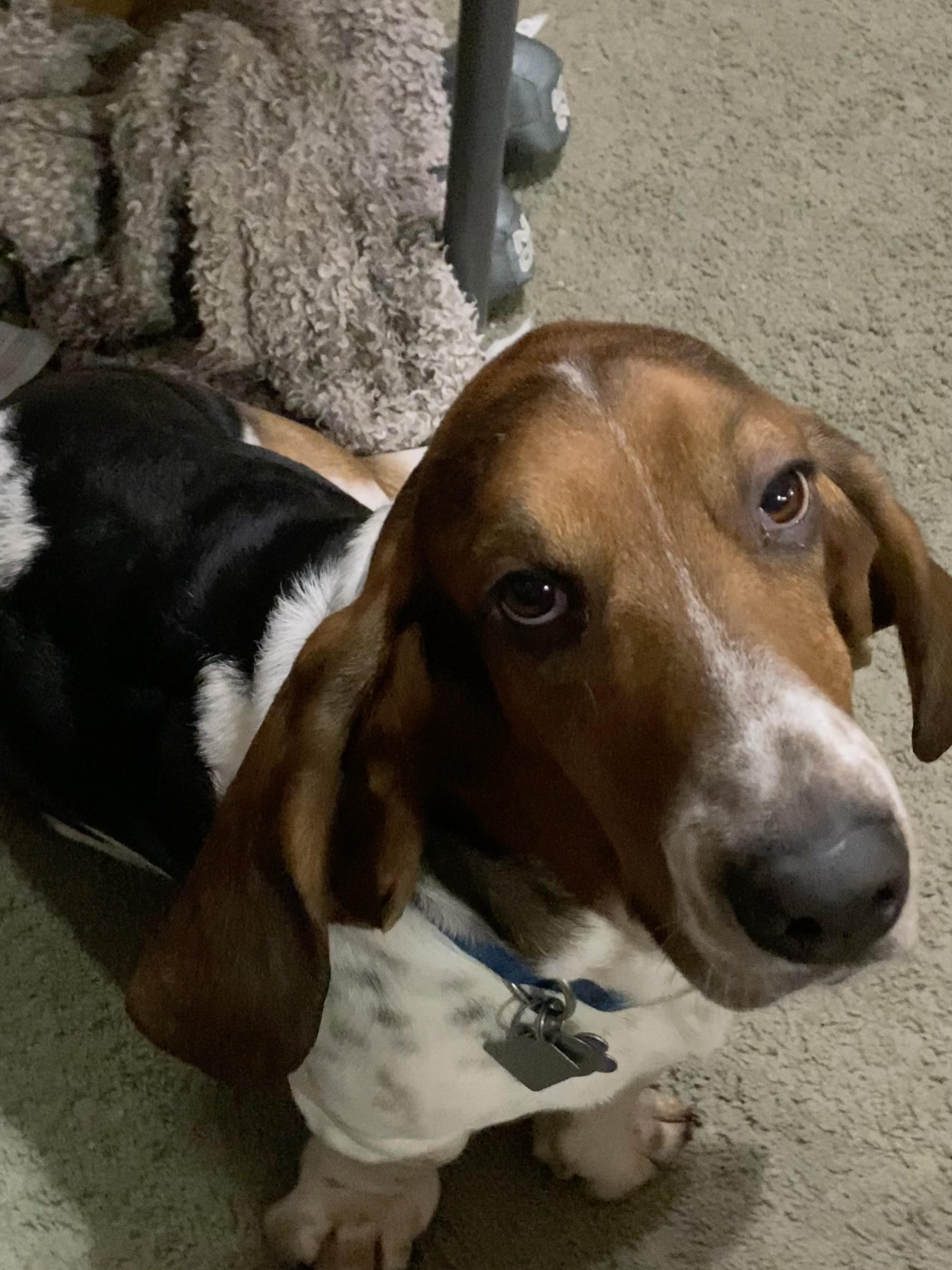 Tri-color Basset Hound. Born May 2019, Bosco is a calm natured American Basset. His days are spent as an ankle warmer and snack tester. His favorite activities are playing with the kids, couch surfing, and eating. He works as a sous chef, ensuring all meals are appropriately taste tested before serving. Bosco has a desire to please his favorite human so much, that he makes sure she is never ever left alone. His offspring will have that built-in desire to please and will make great working dogs, and family members.