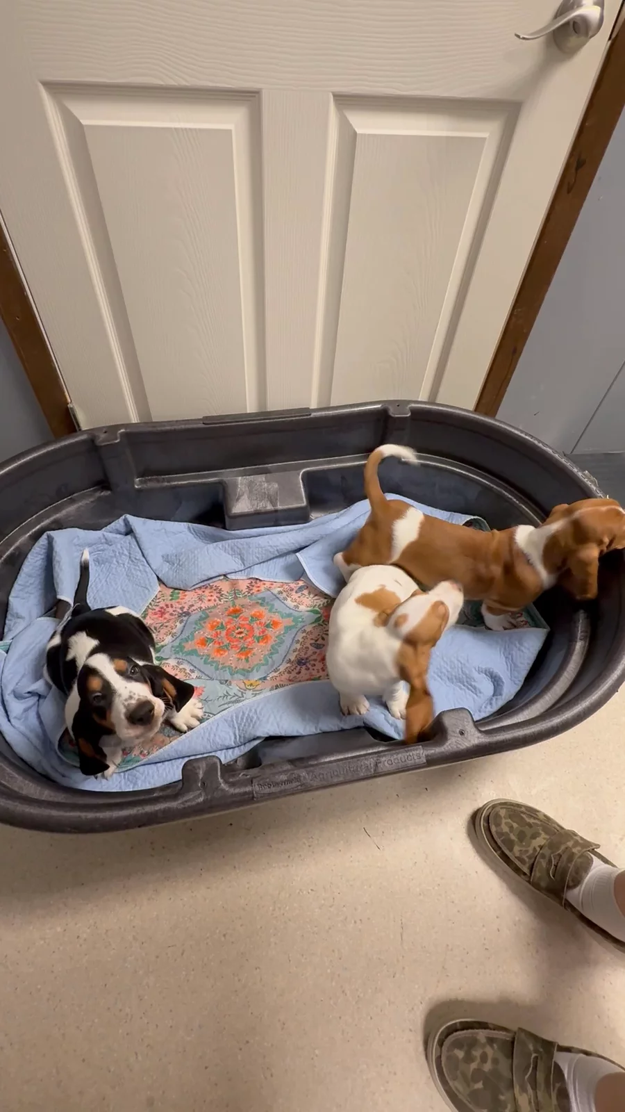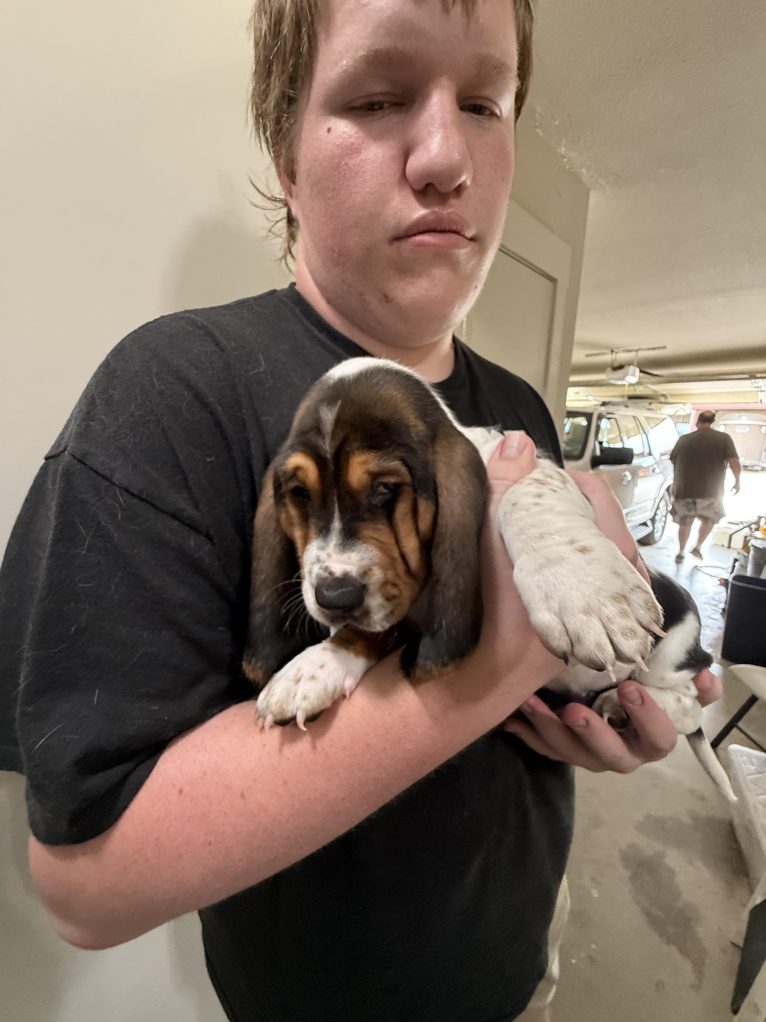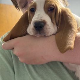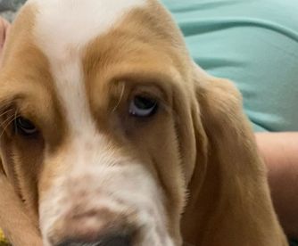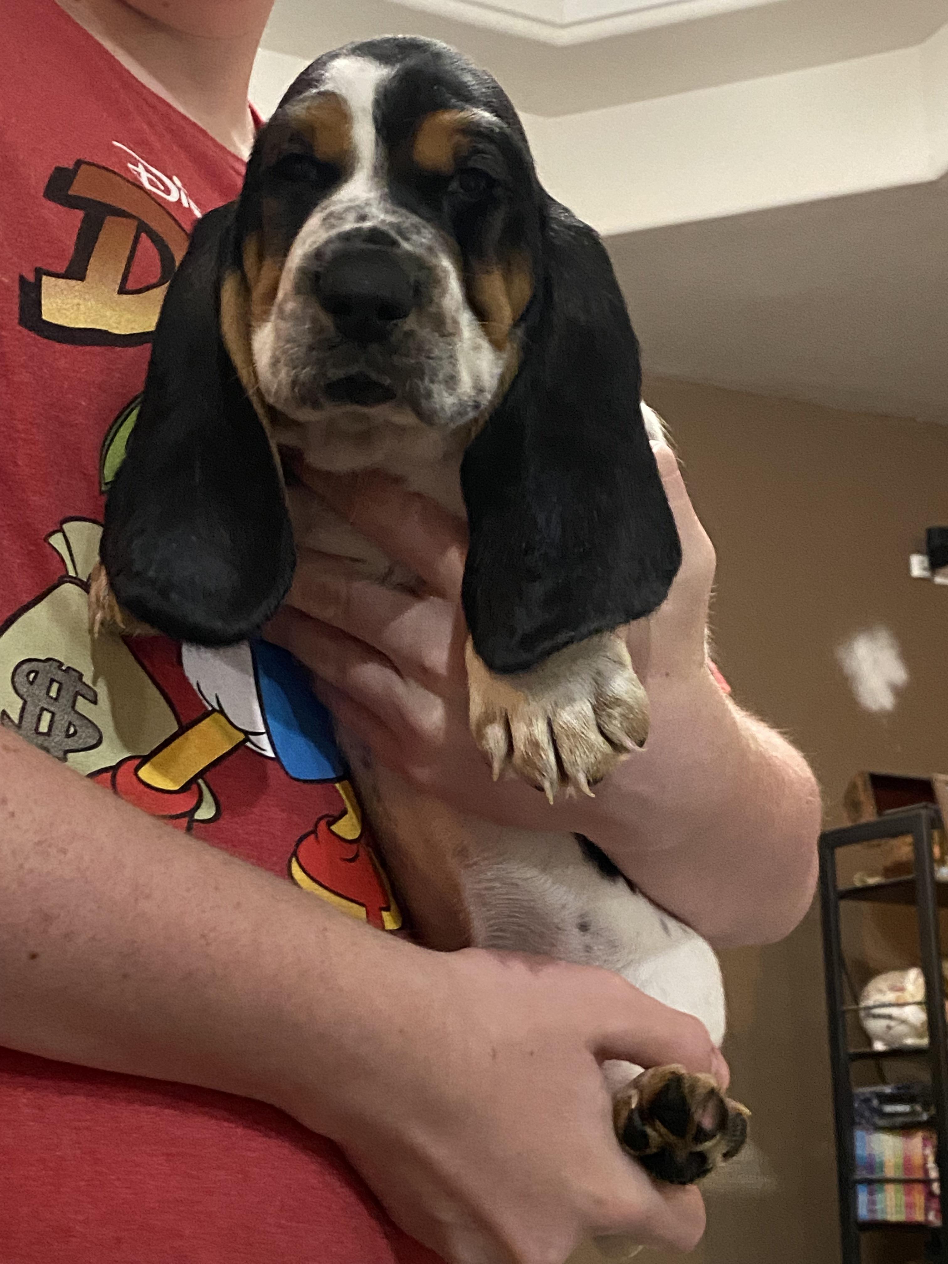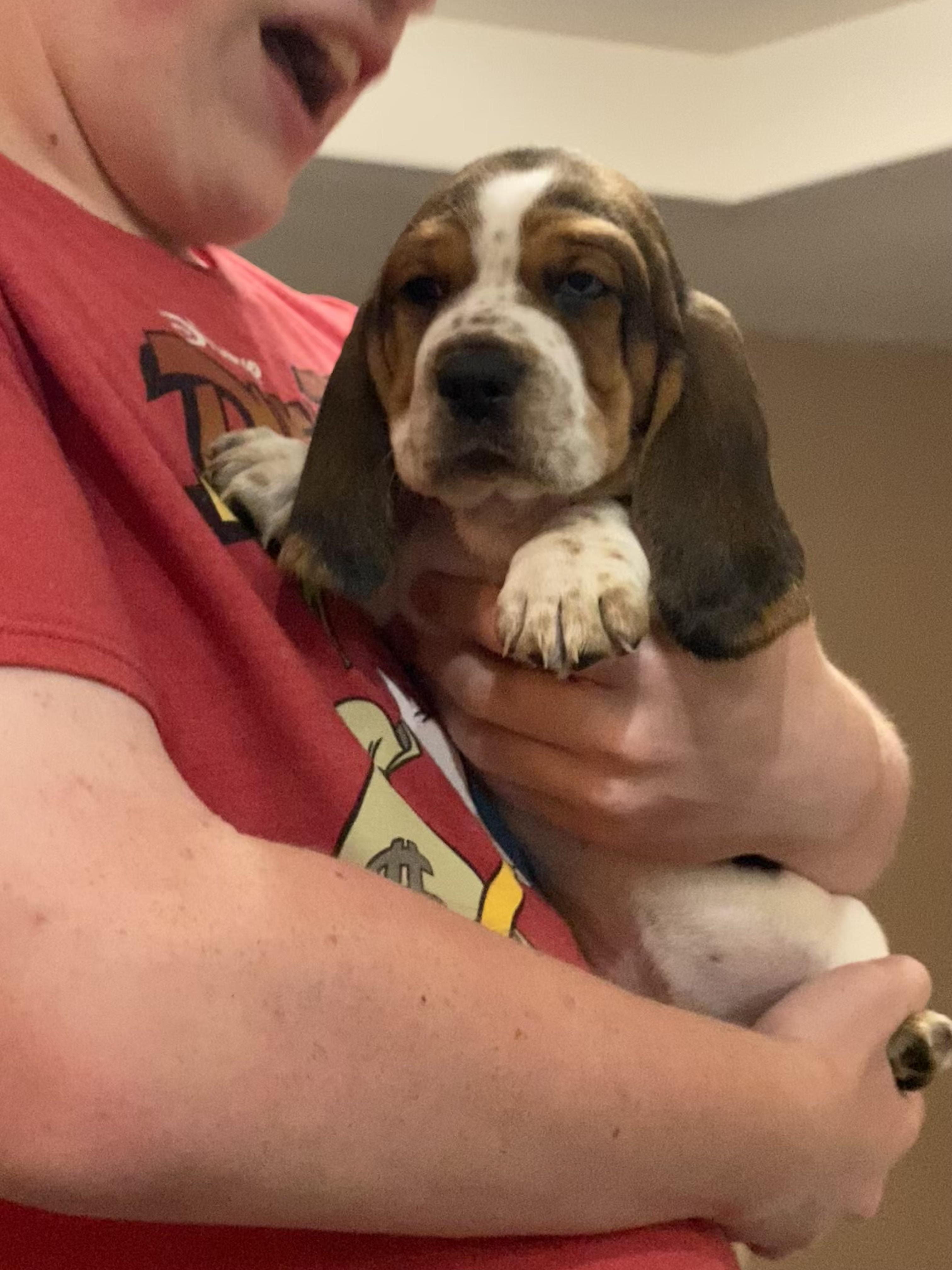 Tri-color Basset Hound. Born May 2019, Bosco is a calm natured American Basset. His days are spent as an ankle warmer and snack tester. His favorite activities are playing with the kids, couch surfing, and eating. He works as a sous chef, ensuring all meals are appropriately taste tested before serving. Bosco has a desire to please his favorite human so much, that he makes sure she is never ever left alone. His offspring will have that built-in desire to please and will make great working dogs, and family members.