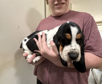 Tri-color Basset Hound. Bosco is a calm natured American Basset. His days are spent as an ankle warmer and snack tester. His favorite activities are playing with the kids and eating. He works as a sous chef, ensuring all meals are appropriately taste tested before serving. Bosco has a desire to please his favorite human so much, that he makes sure she is never ever left alone. Bosco's nose is powerful. He likes scent chasing and will be joining his local scent hound play group when he's done with his farm livestock protection duties. His offspring will have that built-in desire to please and will make great working dogs, and family members.