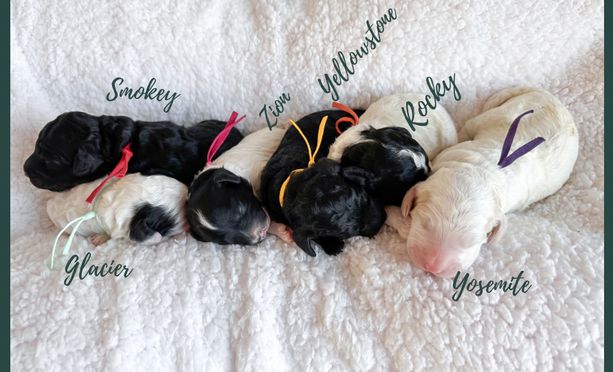 Our Goldendoodle puppies include red, black, and parti. Double Doodle puppies include parti and black. Colors will vary depending on the parent dogs.