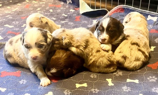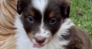 Our puppies include red merle and red tri. Colors will vary depending on the parent dogs.