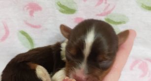 Theo was born in Florida and came to Pennsylvania, where he resides with me and my family. He has a perfect temperament. Theo is a playful, energetic, gentle guy. He is on the larger size with a thick, wavy coat. He is an AKC chocolate parti and carries blonde.