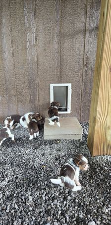 Not much longer until the puppies are available to their new homes!! Teeth are coming in. They are all eating great with no issues during the weaning process. All have found the doggie door! 2 weeks left to find them homes. Could that be yours??