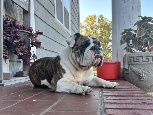 Mocha is a white and red brindle with a champion bloodline. She has a loyal and calm demeanor.