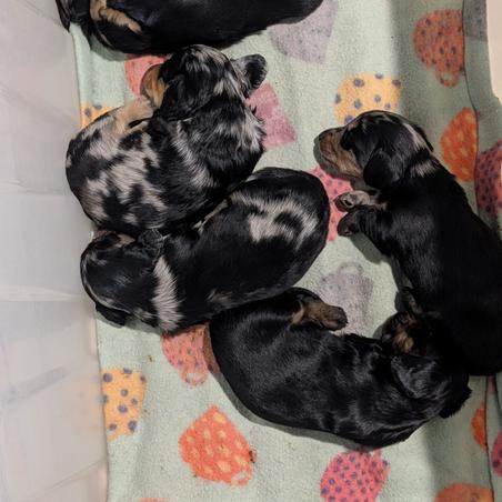 Our puppies include red, chocolate and cream, black and tan, black and cream, and dapple. Colors will vary depending on the parent dogs.