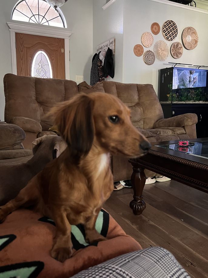 Meet Miss Izzy, she is a mess! She’s in training right now for weenie dog races. Lol. Super-fast and loves treats. Only snuggles when she’s cold, which is all the time. She enjoys laying behind me either on my neck or lower back. She is on the small side of Miniature Dachshunds. Izzy is CKC Registered.
