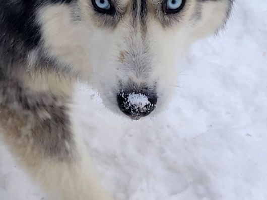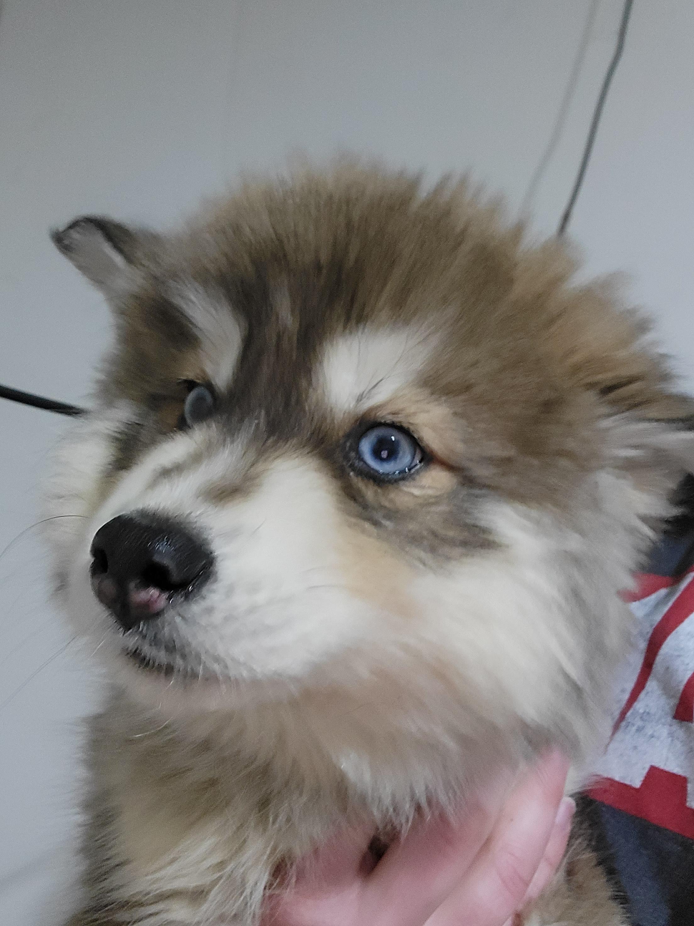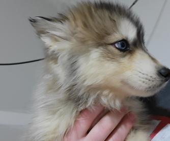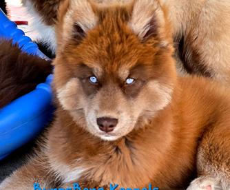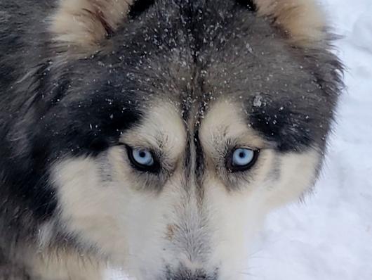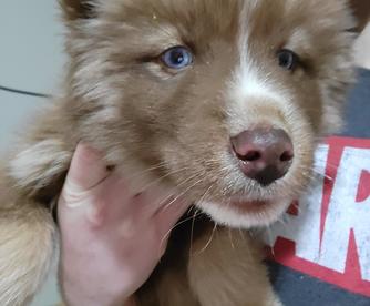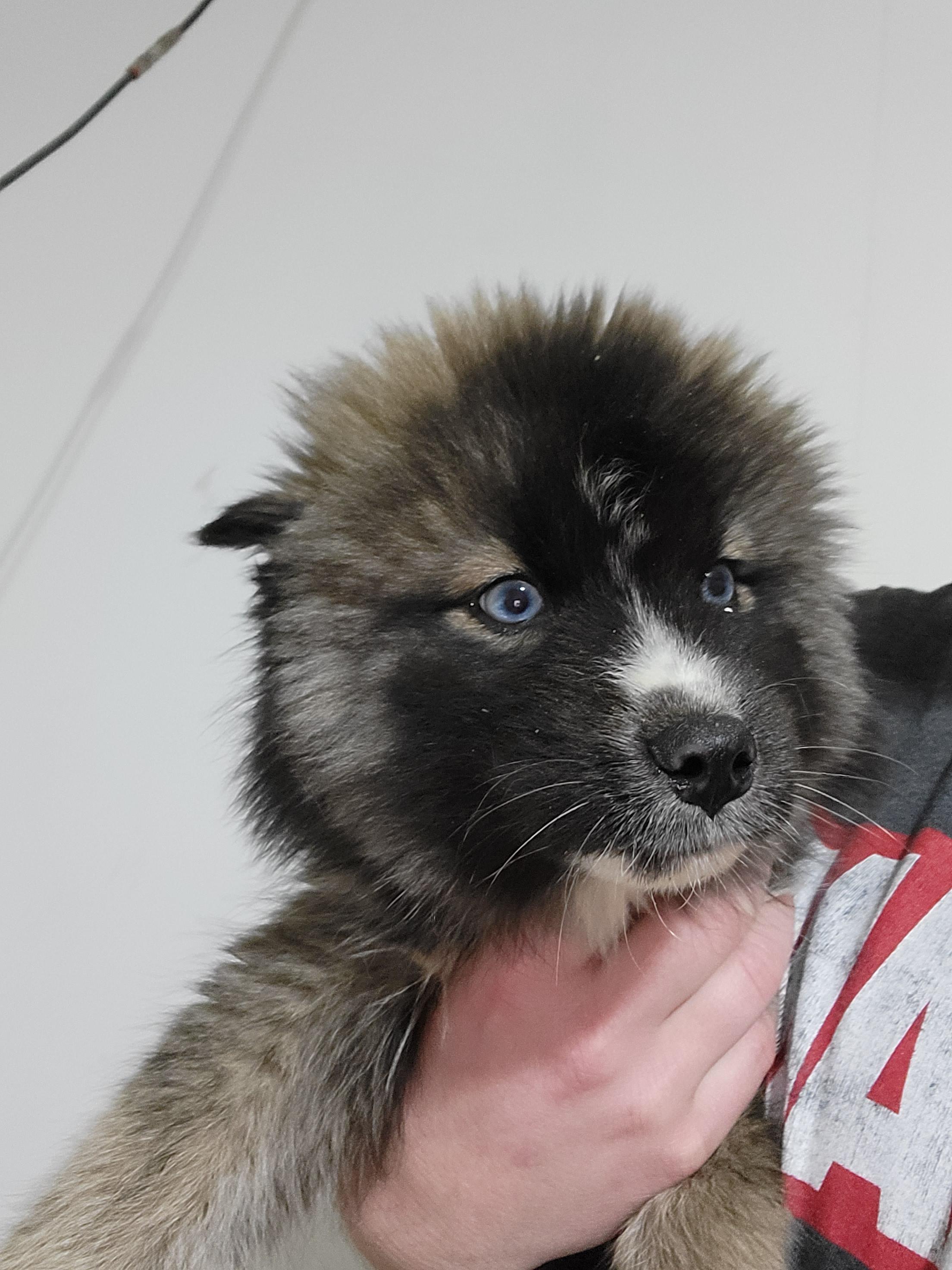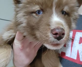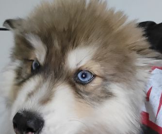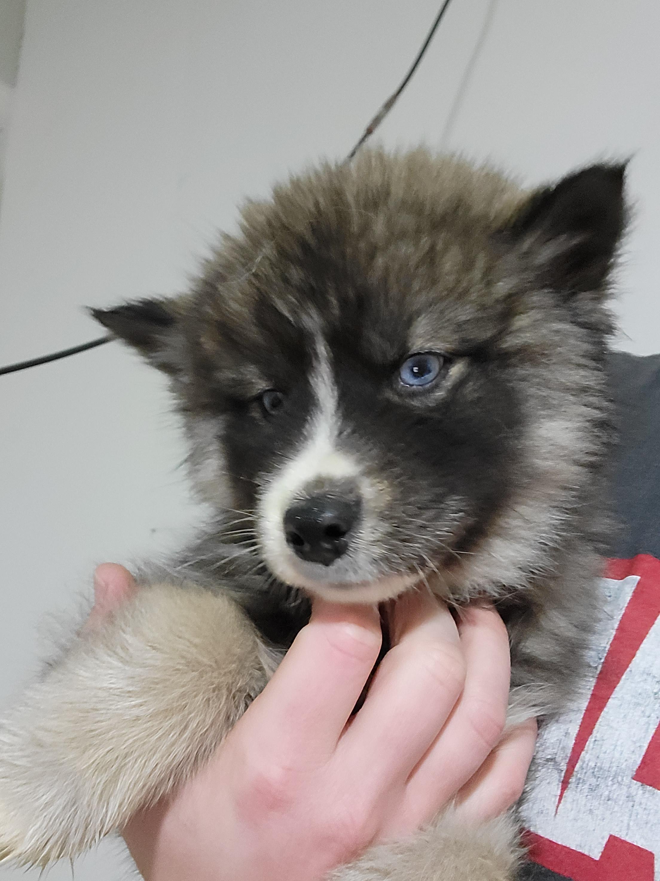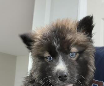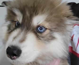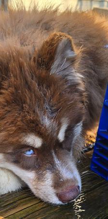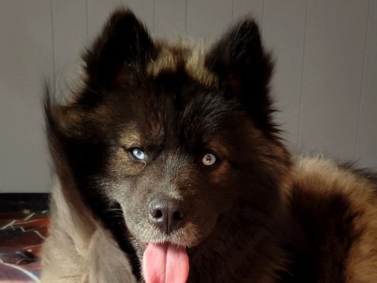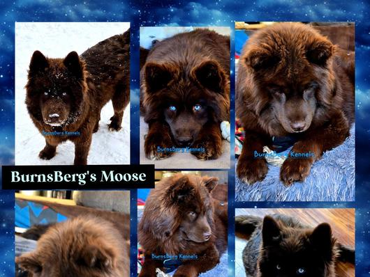 Moose is a dark brown boy with blue eyes. He's a wooly husky and he's very majestic and gorgeous.
