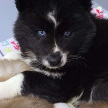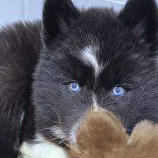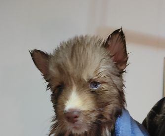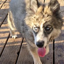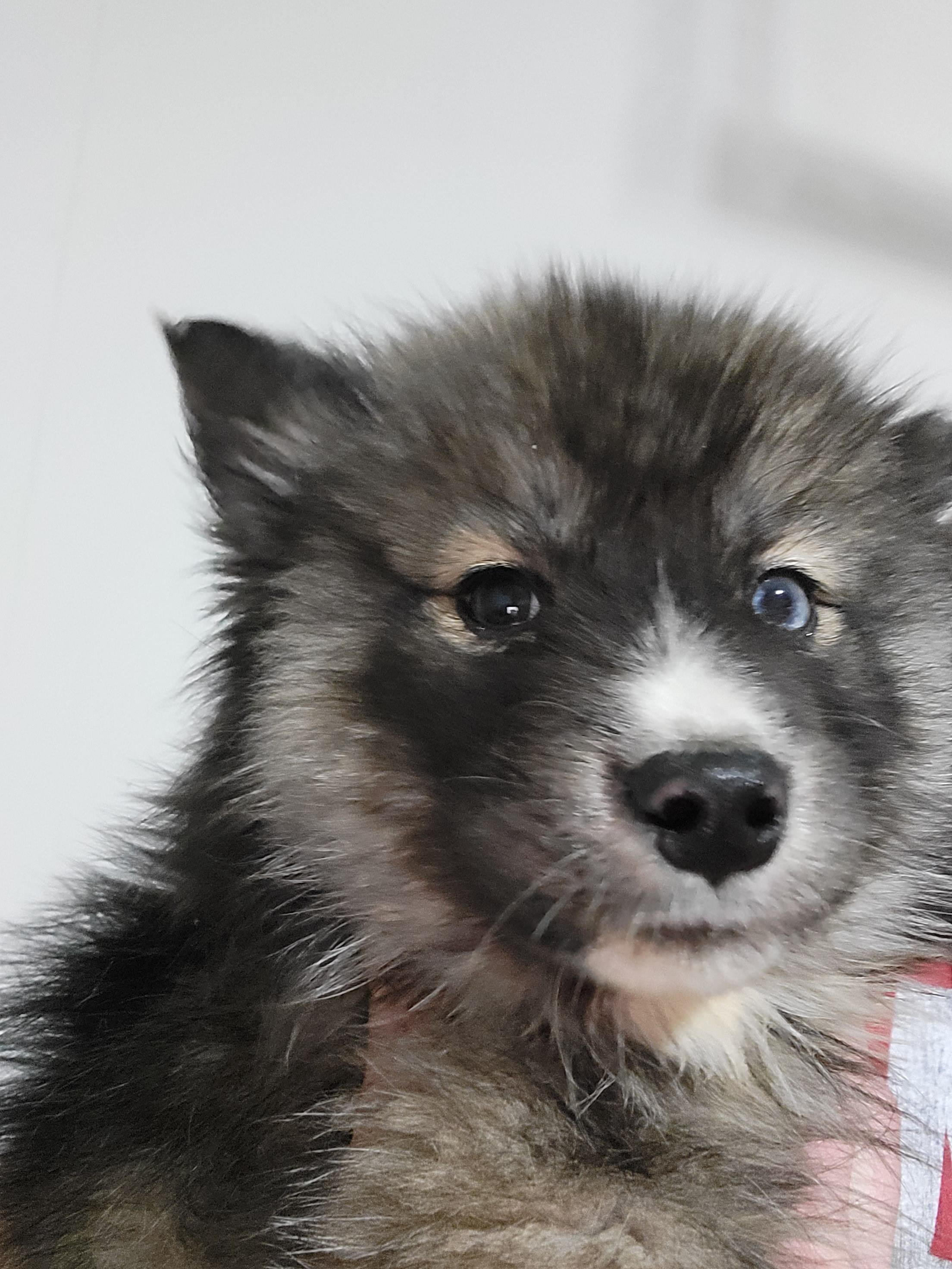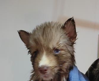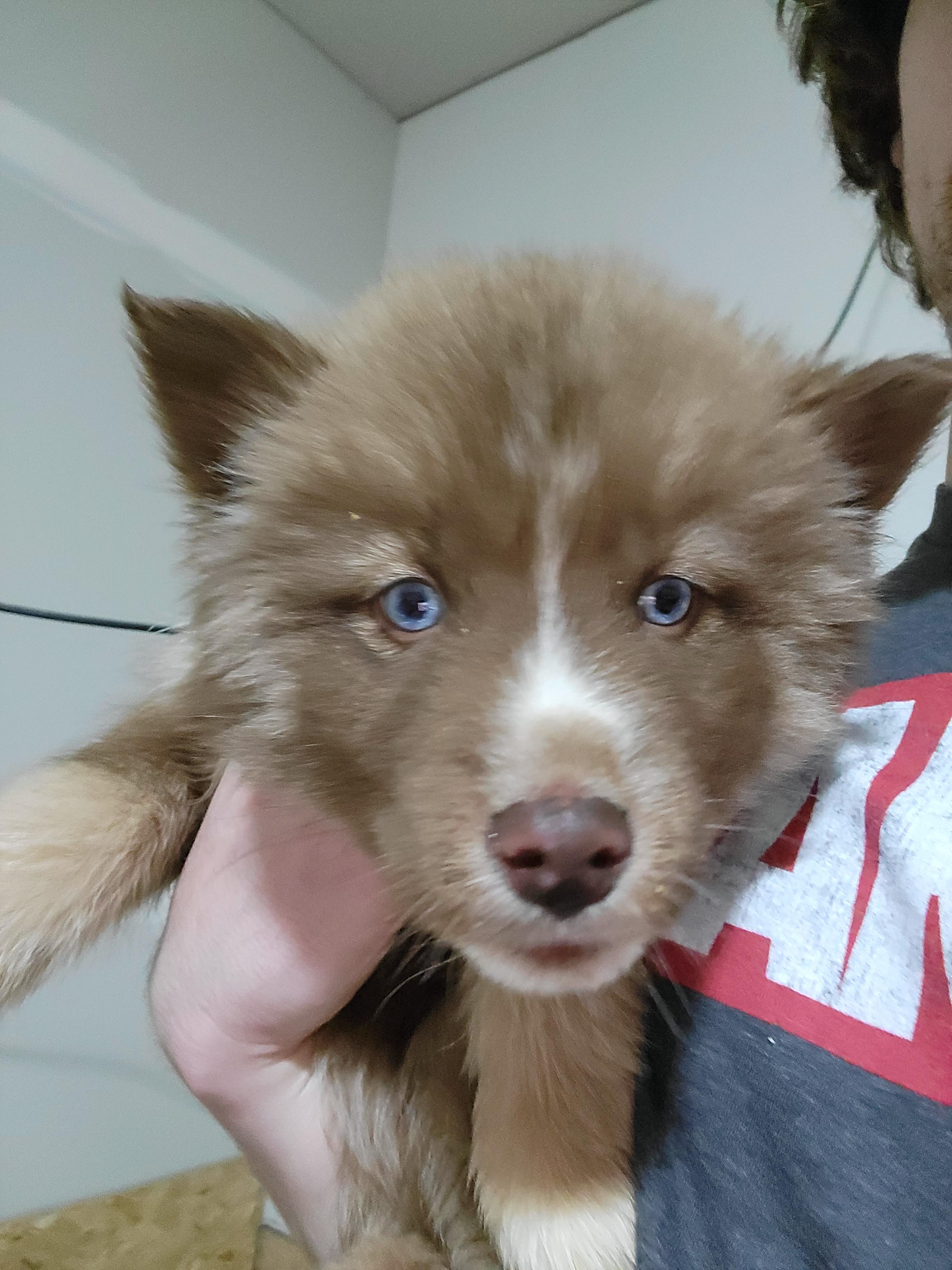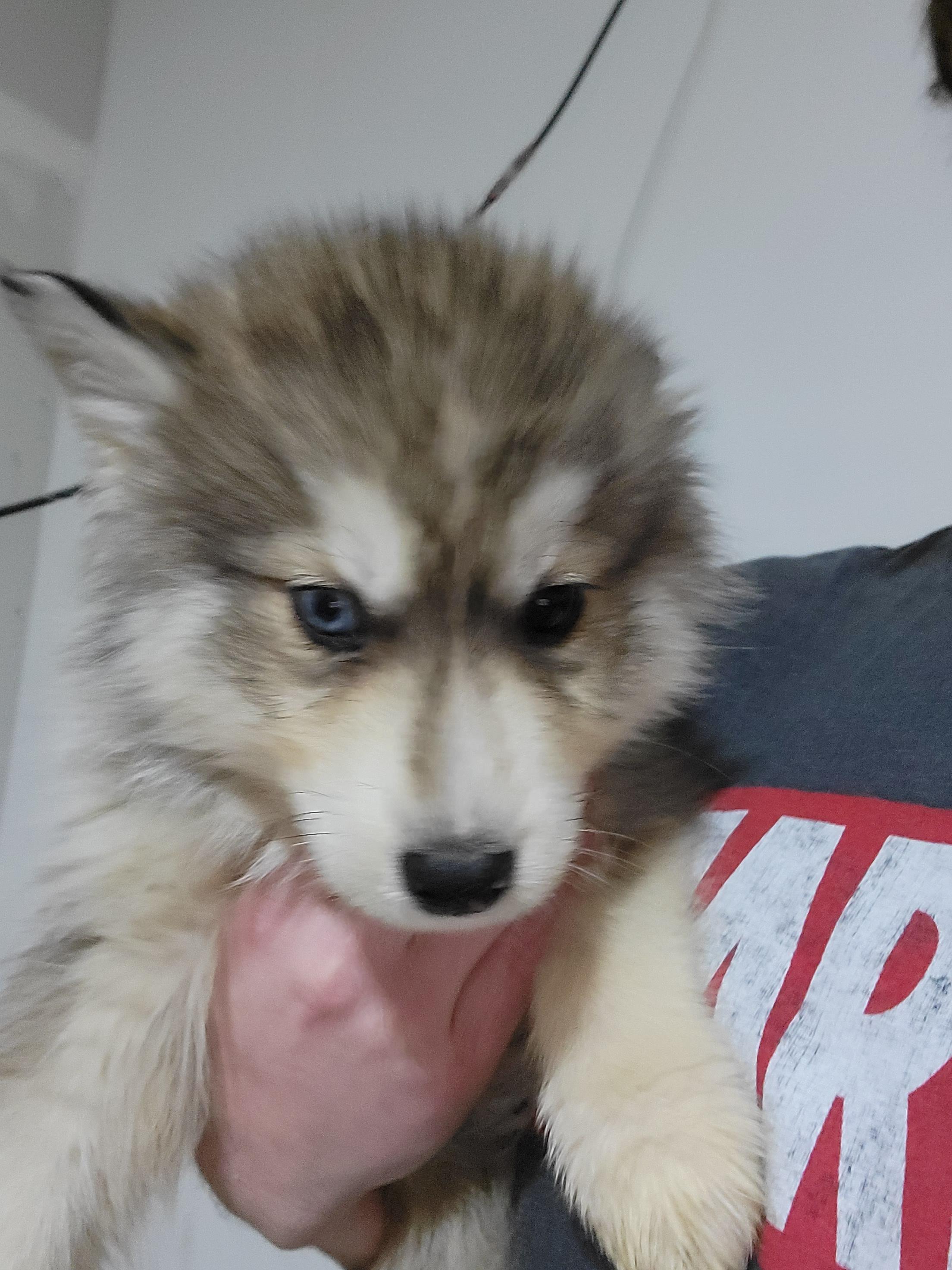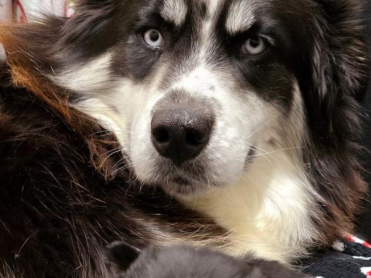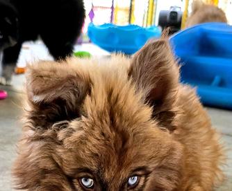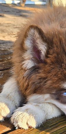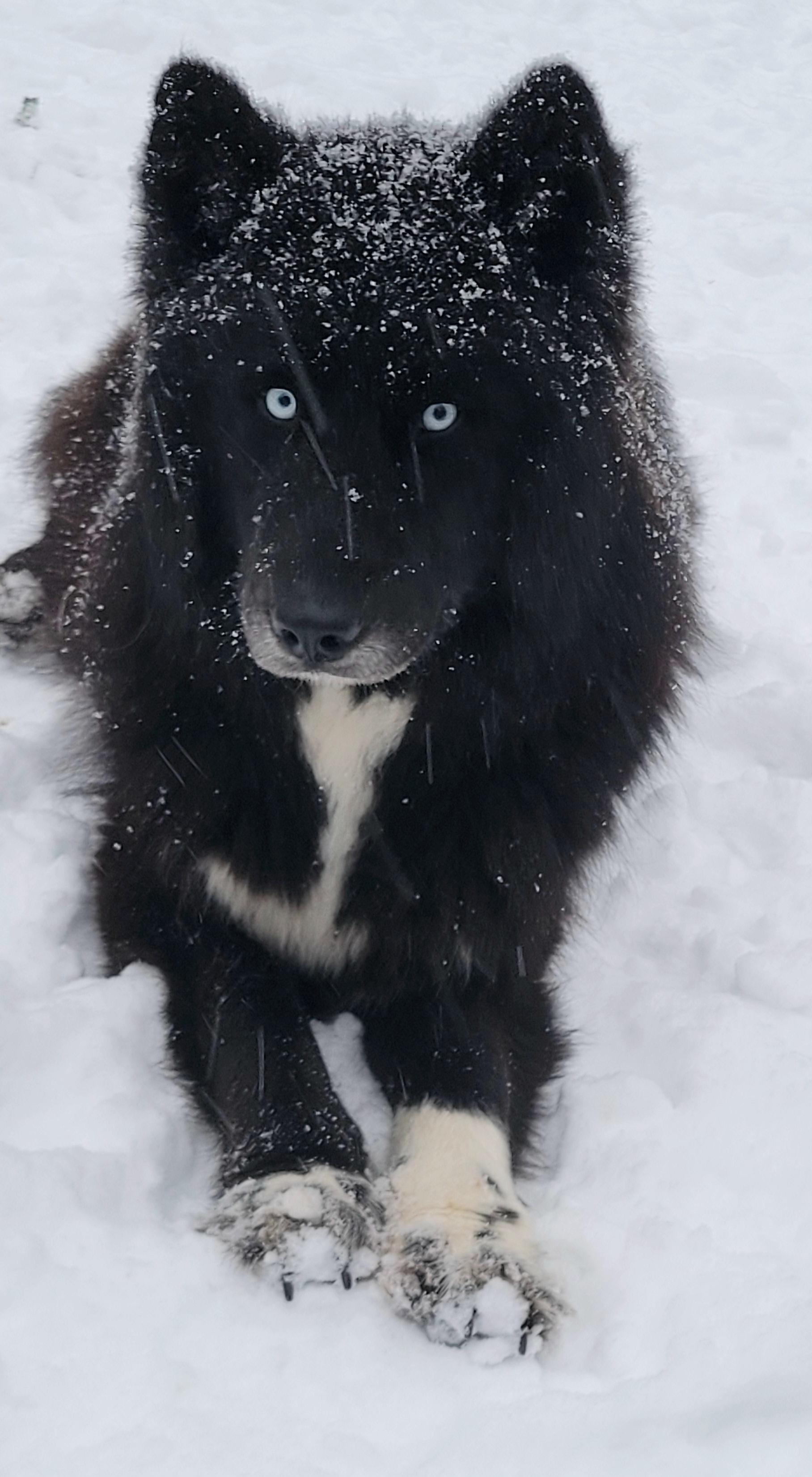 Moose is a dark brown boy with blue eyes. He's a wooly husky and he's very majestic and gorgeous.