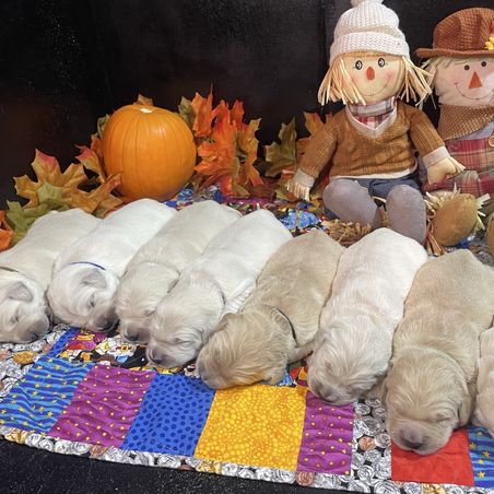 Our Bernedoodle puppies include brown and white, black and white, and tri-color. Golden Retriever puppies include golden and light golden. Colors will vary depending on the parent dogs.