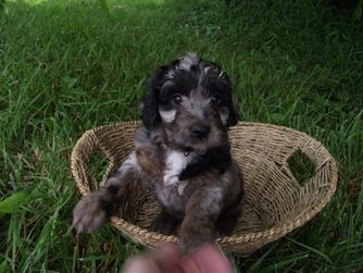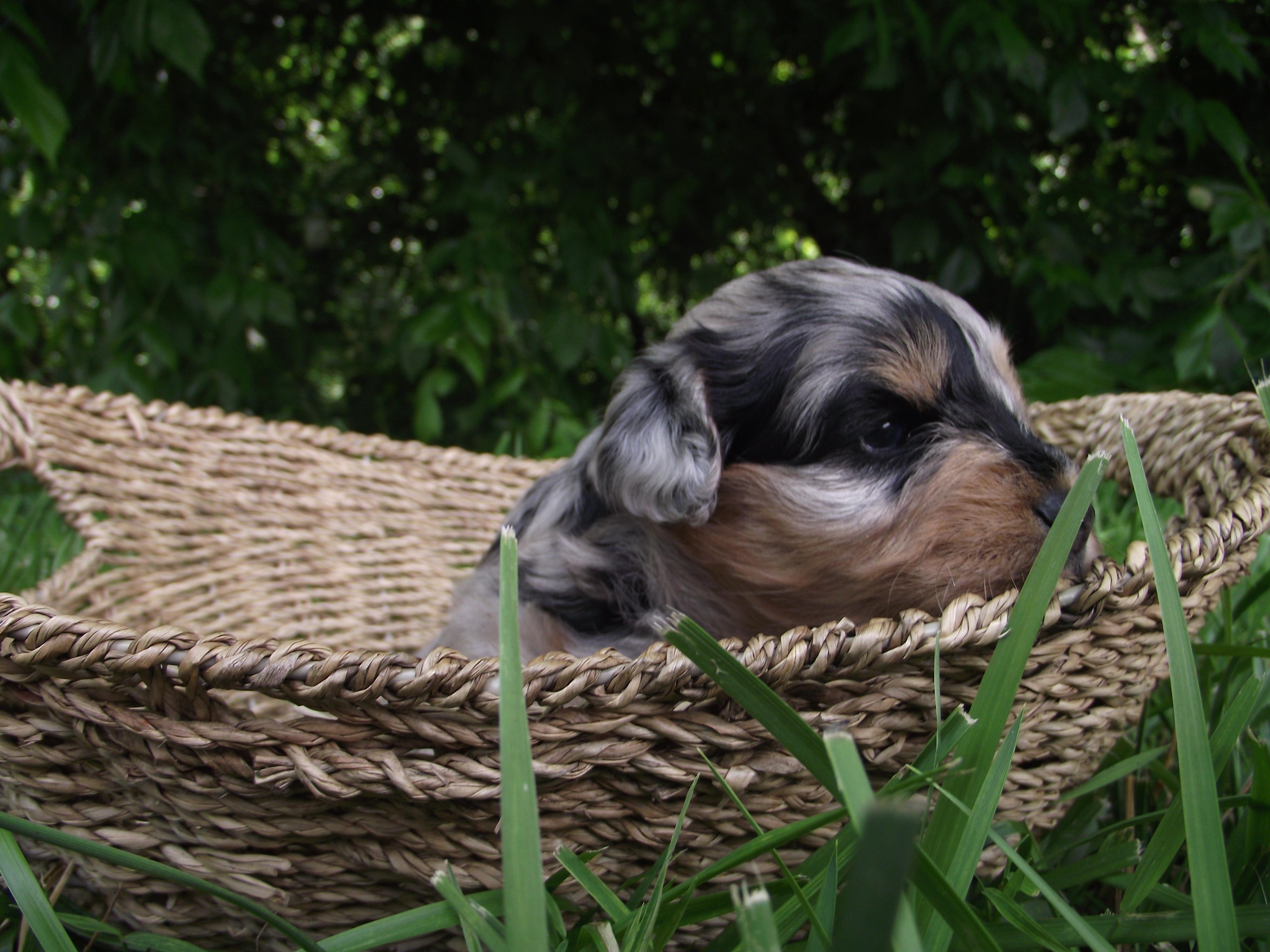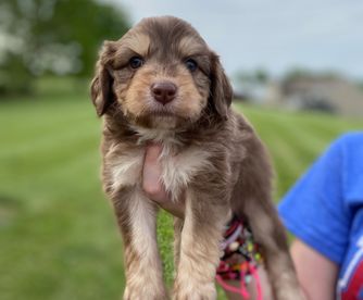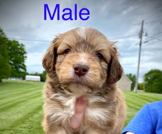 Our Aussiedoodle puppies include blue merle, red merle, black phantom, black and white, black tri-color, red phantom, and red tri-color. Miniature Australian Shepherd puppies include red & white, black & white, blue merle, black tri, red tri, red merle, red, and black. Goldendoodle puppies include cream, apricot, red, chocolate, black, merle, and parti. Colors will vary depending on the parent dogs.