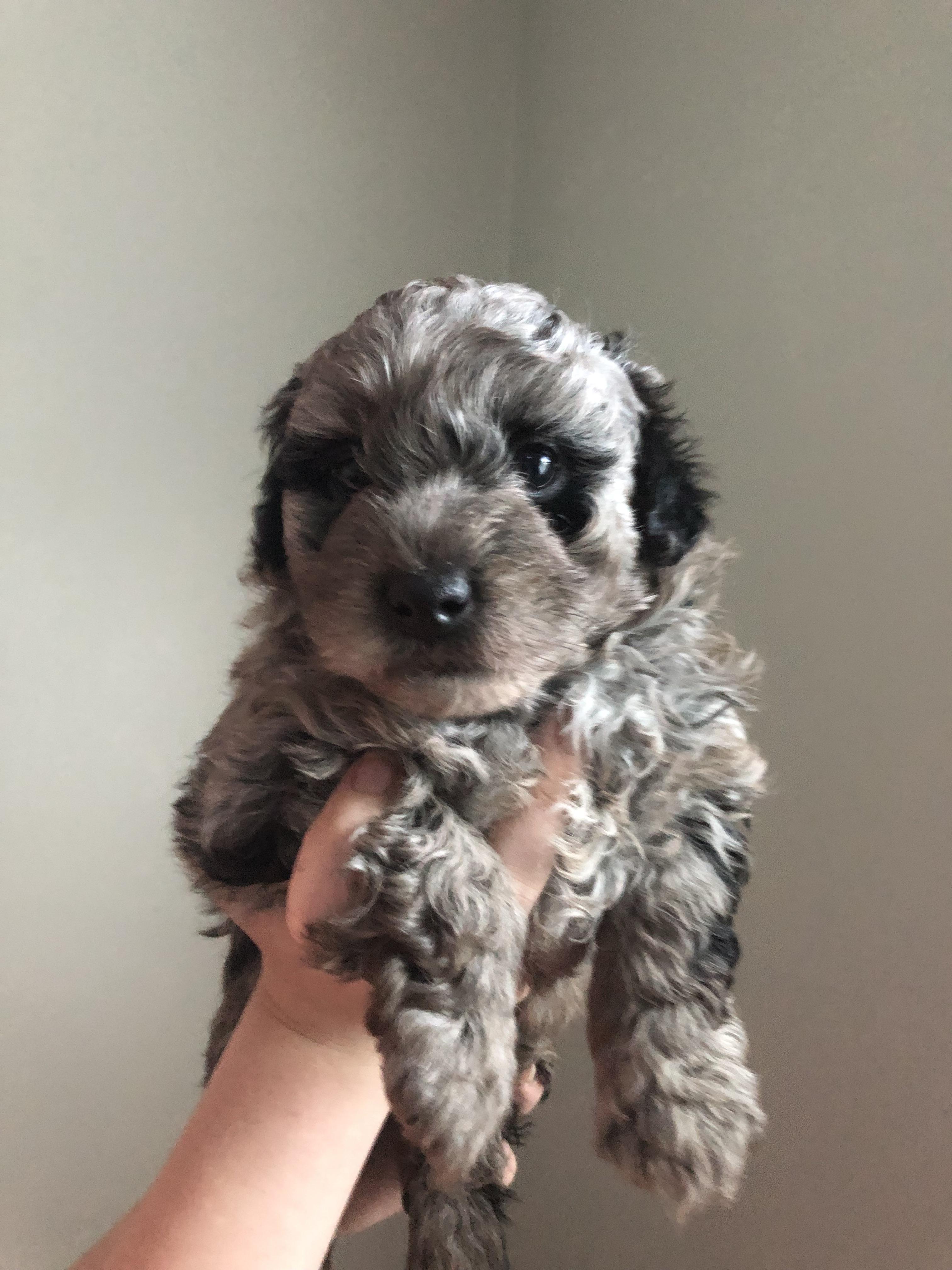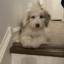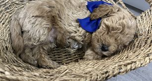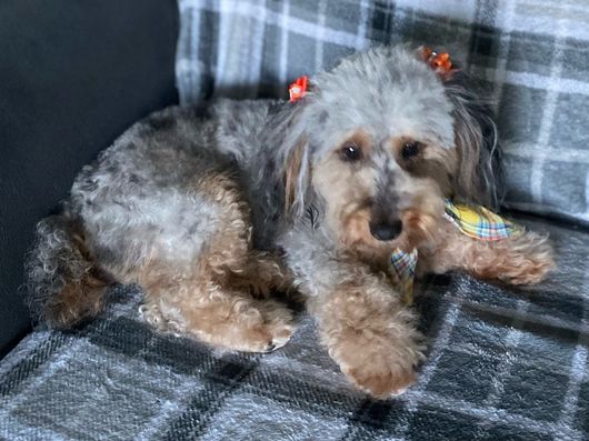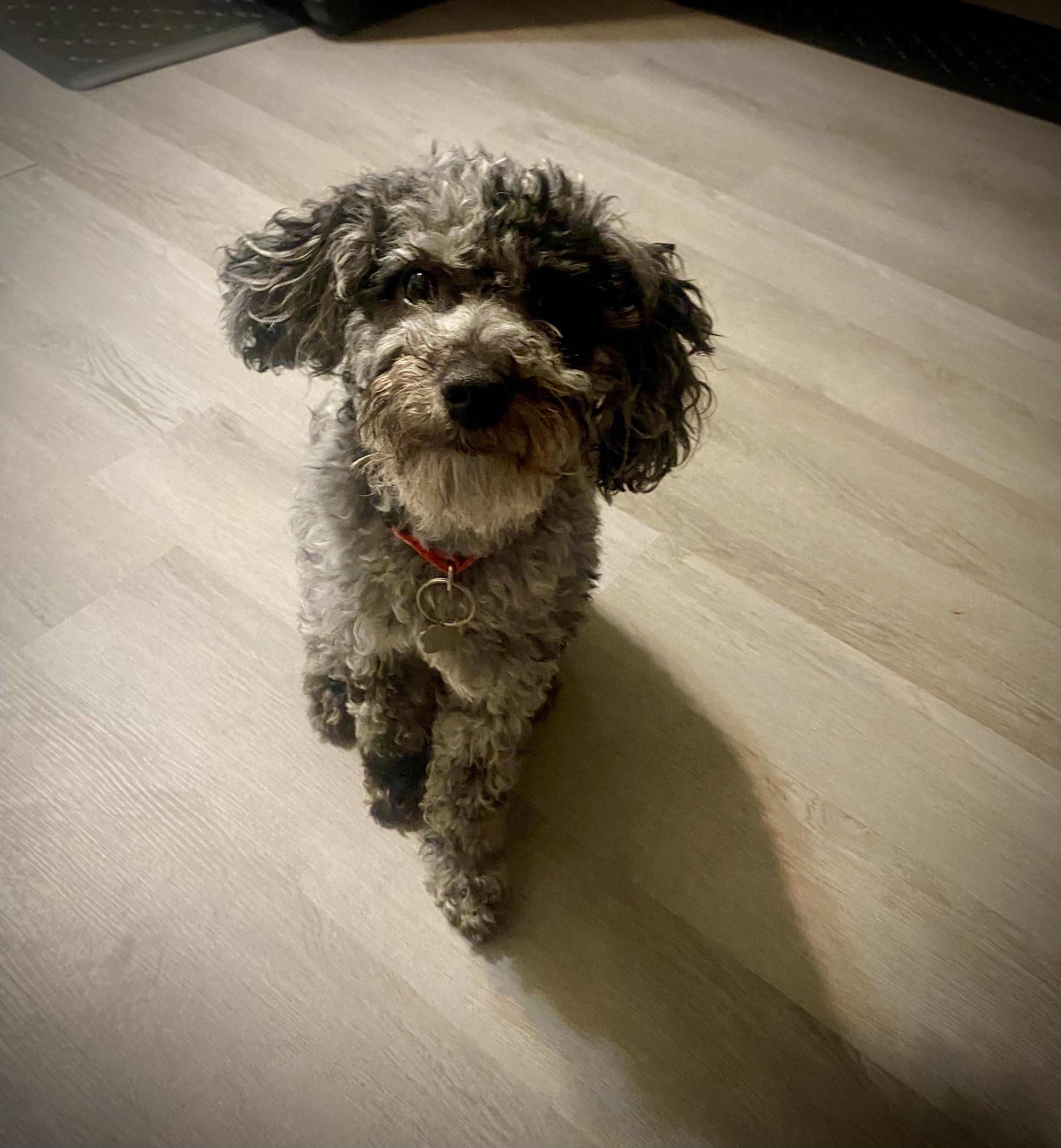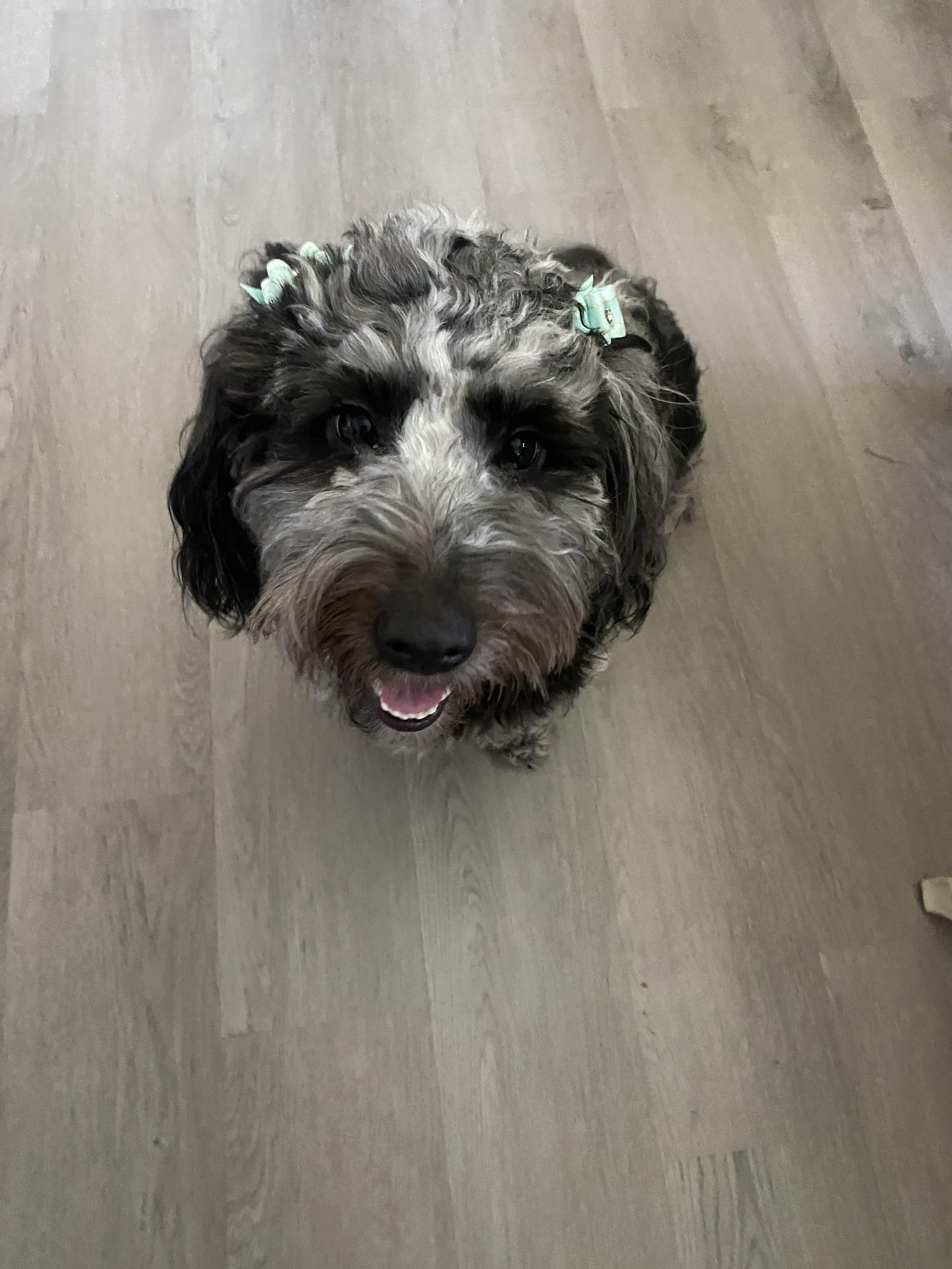 Minnie is a very sweet and smart mini Golden Doodle. She’s a full blue merle and weighs 13 pounds.