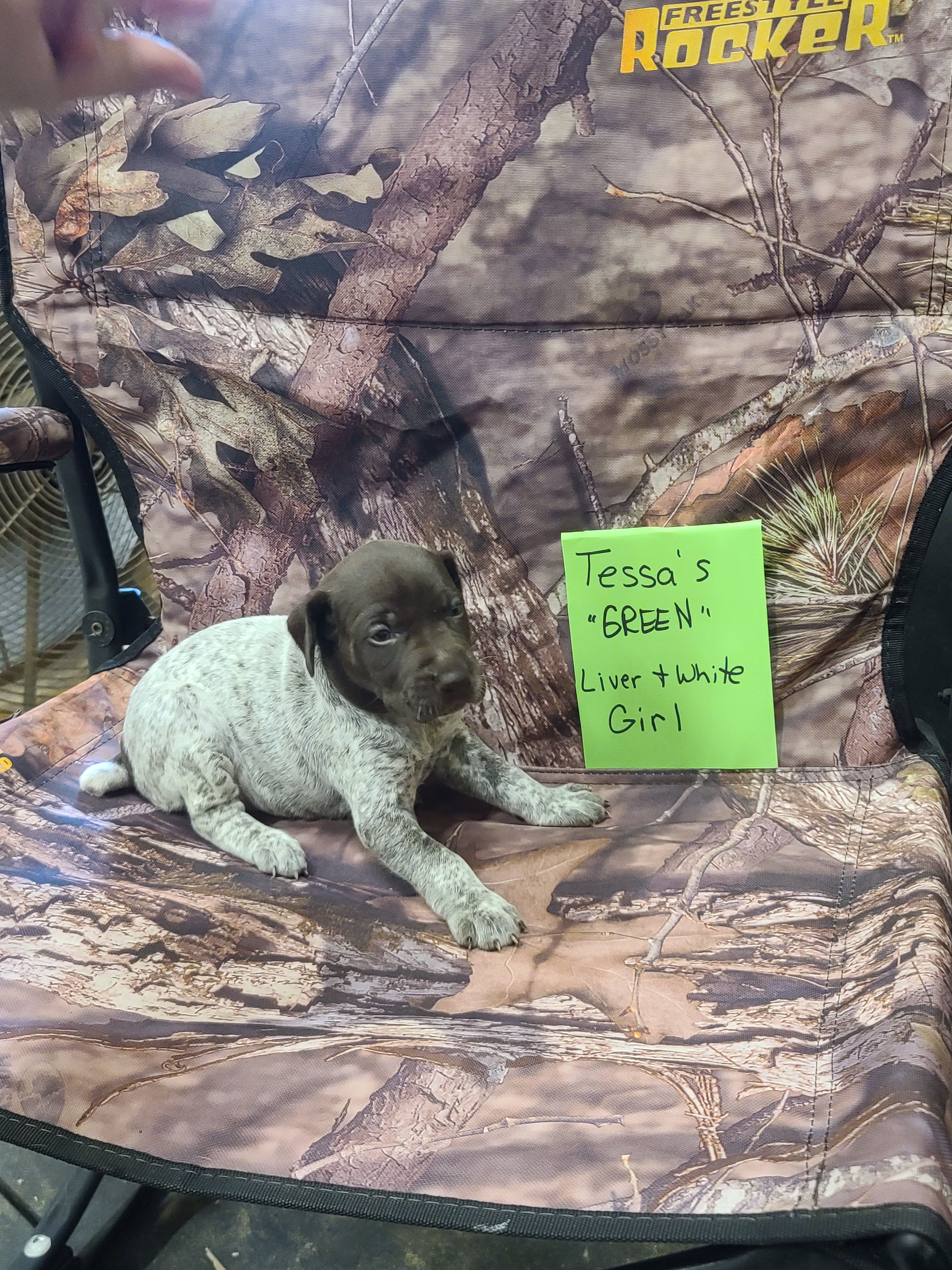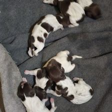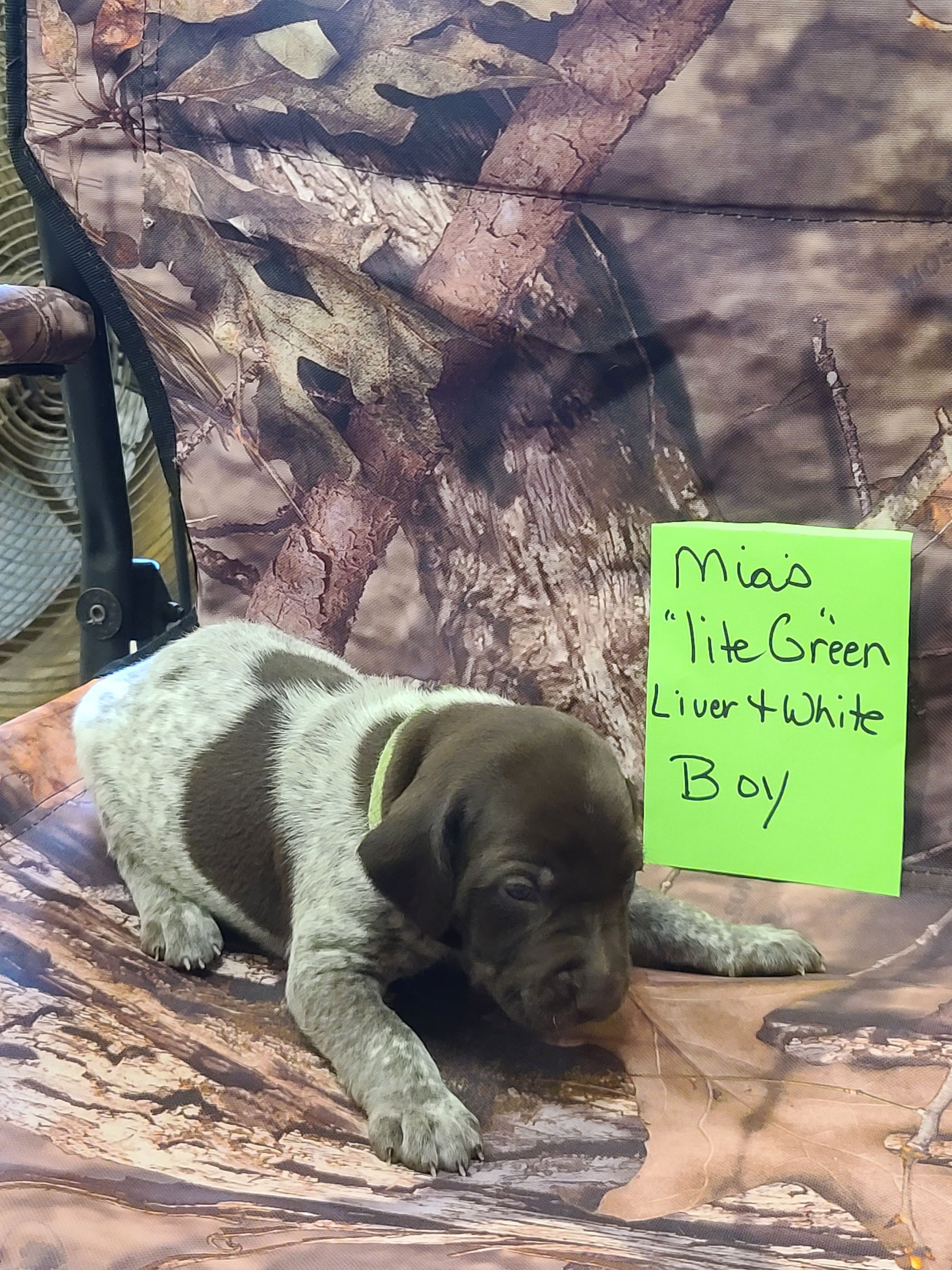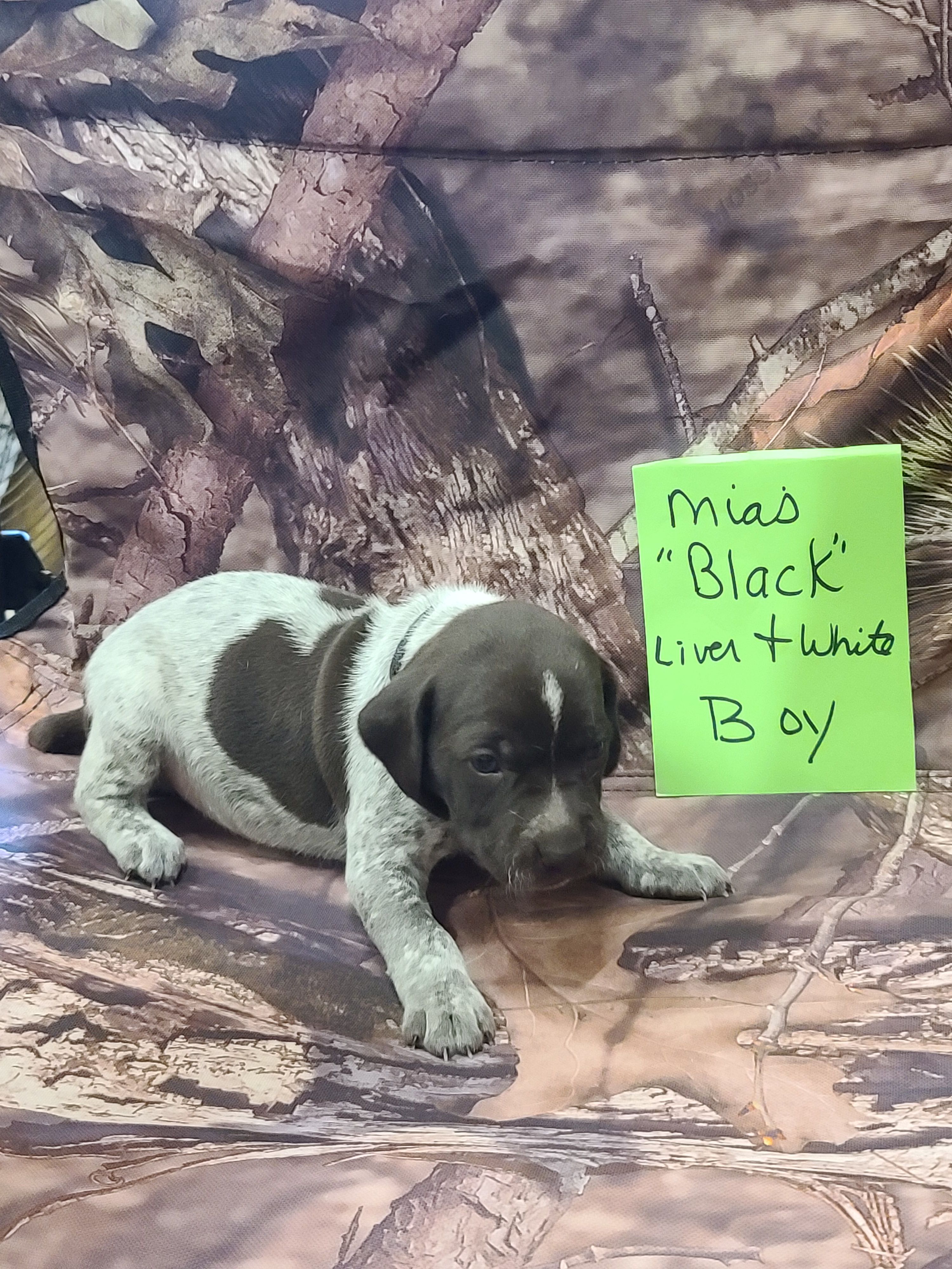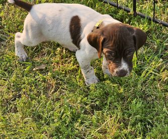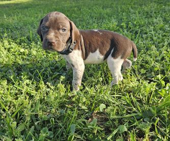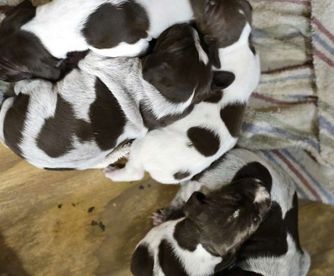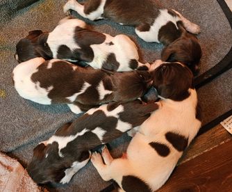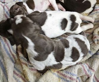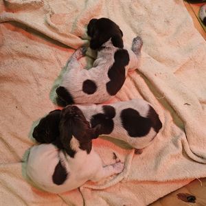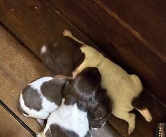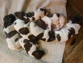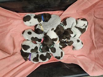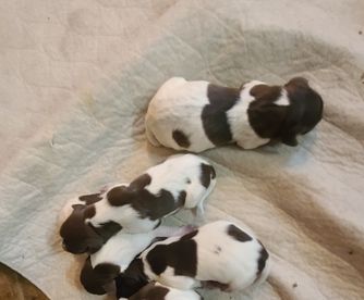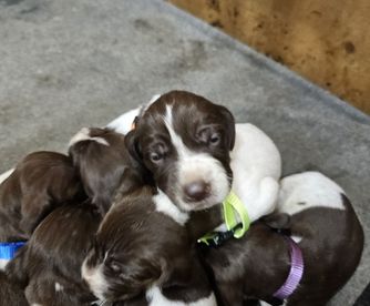 Our puppies include white and liver, liver and white, liver roan, and liver. Colors will vary depending on the parent dogs.