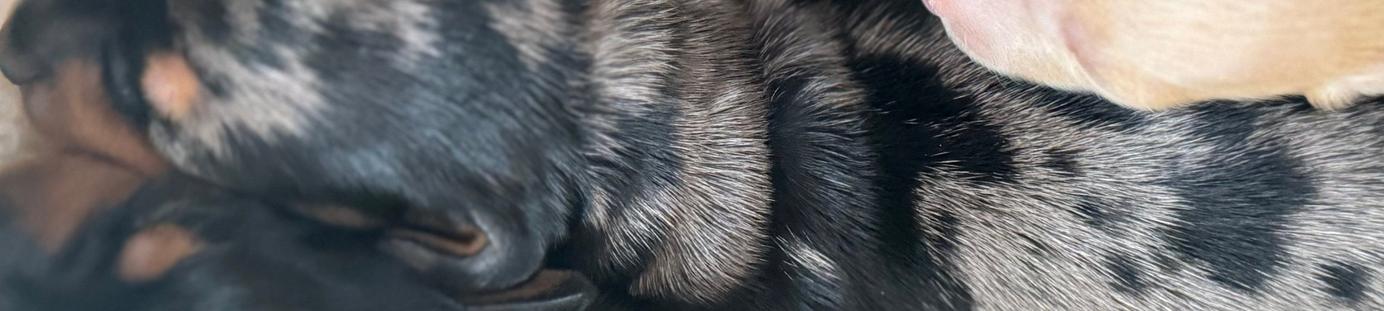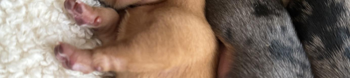 Our Goldendoodle puppies include cream, apricot, chocolate, black, merle, and parti. Dachshund puppies include piebald, chocolate and tan, black and tan, and dapple. Colors will vary depending on the parent dogs.
