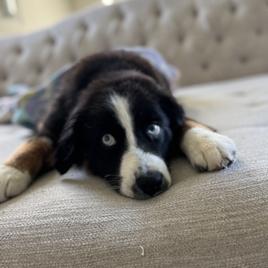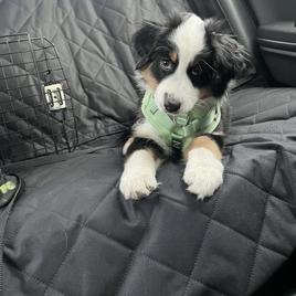 Duke (we kept his name, it fit him perfectly!) just turned 1 year old and from day one we have had the best experience, from our first call with Mary - who was super supportive and excited along with us throughout the process - to picking up Duke and bringing him home. He has a friendly and easygoing temperament, he loves to play with other dogs and is so friendly towards people. He loves to go on long walks but also enjoys a lazy day on the couch, and everywhere we go he gets compliments on how great his markings and figure are. We couldn’t ask for a better experience with getting our first dog, and would recommend Cabin Hearth and Mary to anybody looking for the mini Aussie breed!