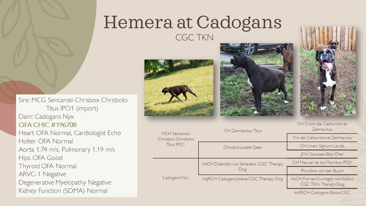 Cadogans Boxers reports to performing the health tests below on their breeding dogs. Ask your breeder about the tests performed on the parents of your litter. Learn more about health testing for Boxers.