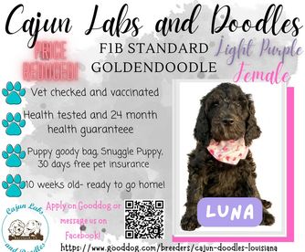 I'm Monica M., the breeder behind Cajun Doodles located in Raceland, LA. We are home-based breeders dedicated to bringing healthy, loving, and high-quality dogs into the homes and hearts of their forever families. All of our dogs are raised in our home. We love our dogs and are passionate about raising our puppies and finding them the perfect family.