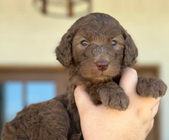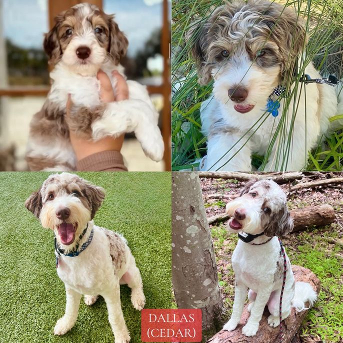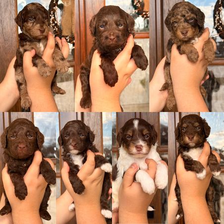 Our Aussiedoodle puppies include brown and white, red merle, red phantom, and red tri-color. Goldendoodle puppies include chocolate, phantom, merle, and parti. Colors will vary depending on the parent dogs.