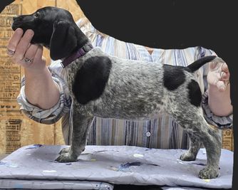 Raven has a full personality that demands your attention, a very loving girl and fun to be around. She excels in the field and in water. A close to mid range hunter who is very biddable.