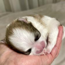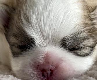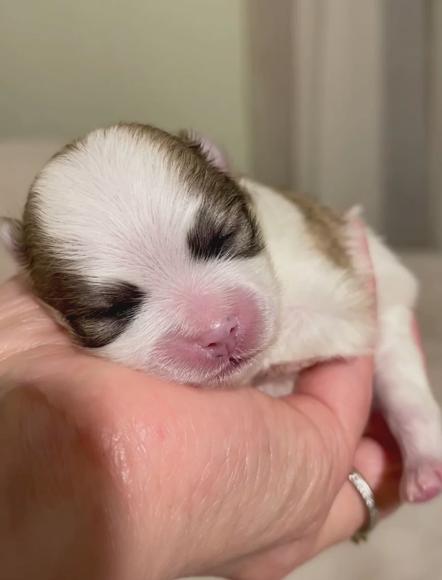 The puppy is one week old today and still small enough to cuddle in one hand.