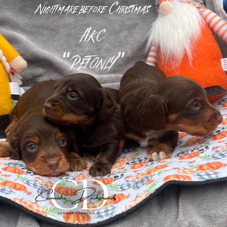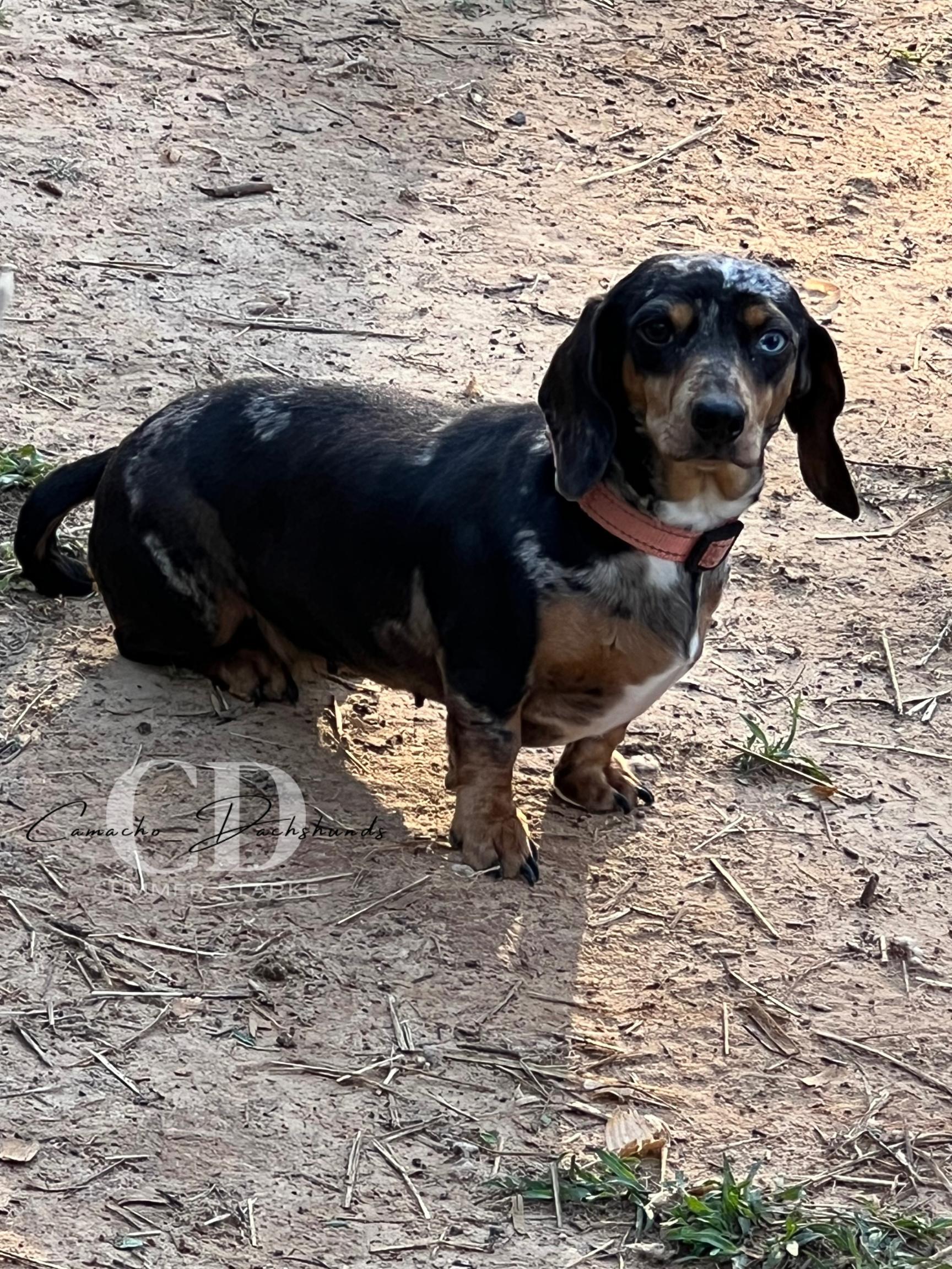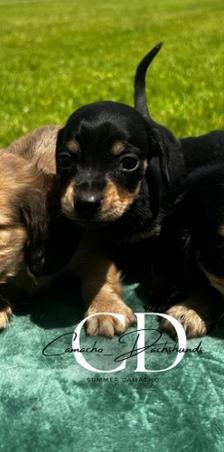 Summer aka Camacho Dachshunds, breeds the best mini dachshunds. She is absolutely amazing!! She is so very easy to work with. She responds quickly to all texts and questions, and I had a lot. She sent me photos or videos weekly, just to keep me updated on his progress. My puppy was 9 weeks old when I got him. He was so well socialized that he loved and played happily with my whole family. He even slept through the first night. I have now had Ezekiel for a week and he is smart, spunky sweet, and healthy. Passed his first vet check with flying colors. I am so happy with the whole experience. Summer thought of everything, even sending home a bag of goodies to start him off right. Wonderful, thoughtful, and careful breeder, truly comitted to breeding healthy, quality doxies. Thank you for my beloved boy!!