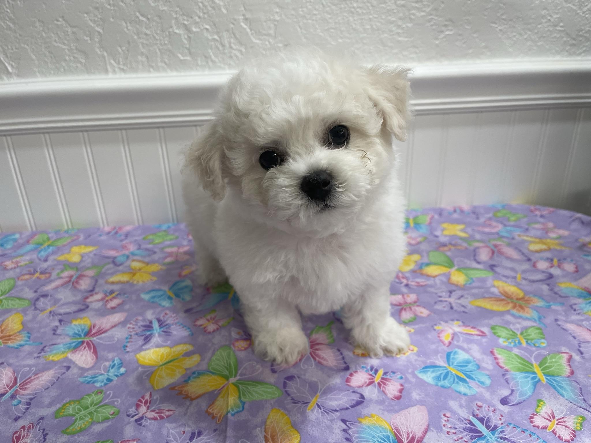 Our Bichon Frise puppies are white. Havapoo puppies include chocolate and white and black and tan. Havanese puppies include red, chocolate, black, and black and tan. Colors will vary depending on the parent dogs.