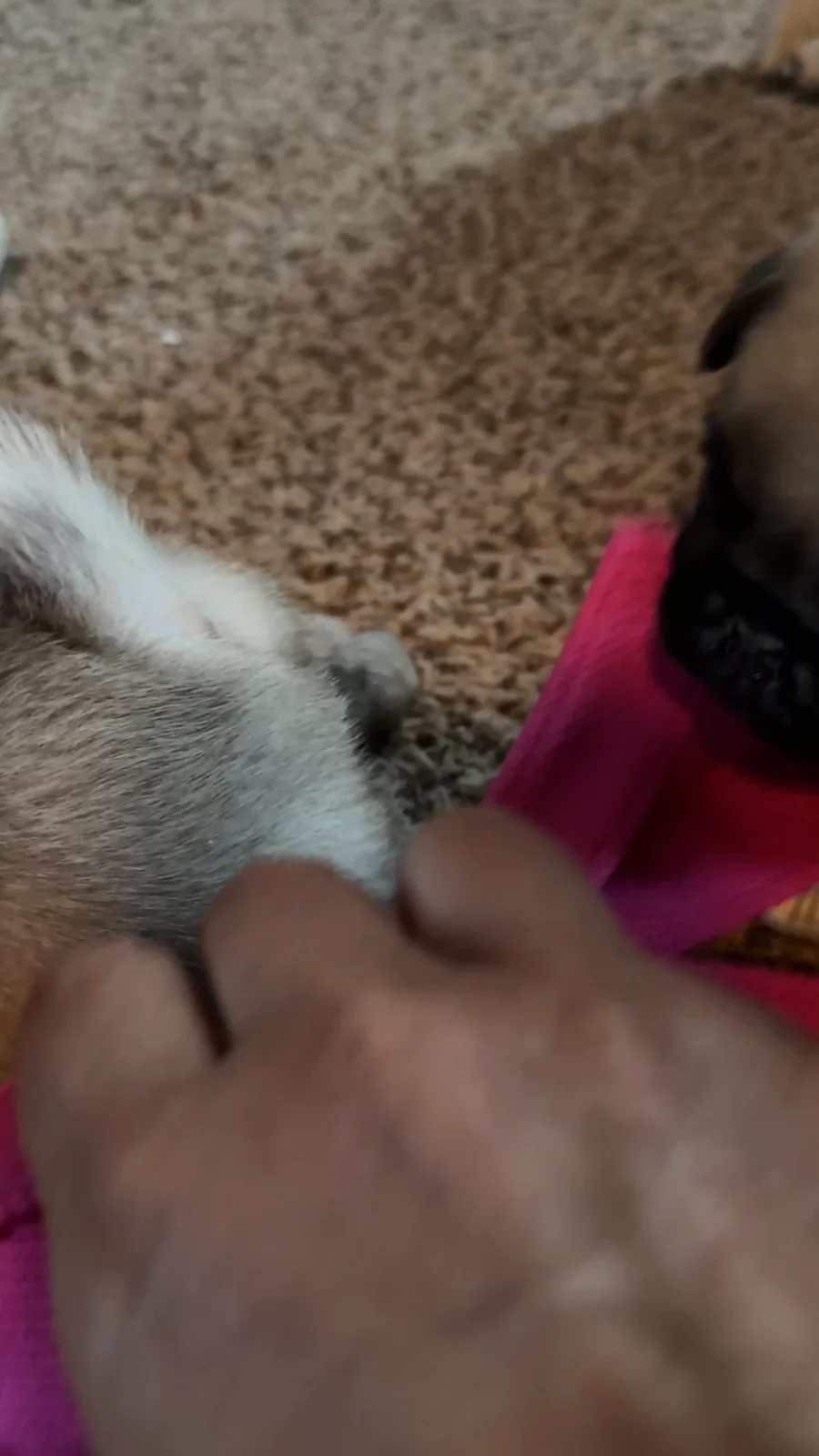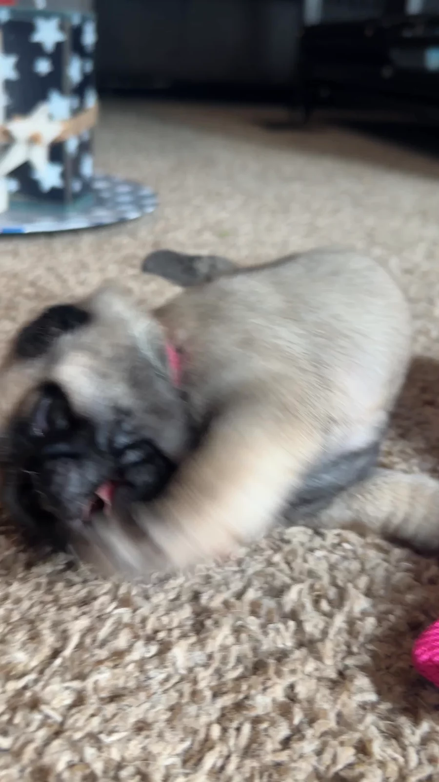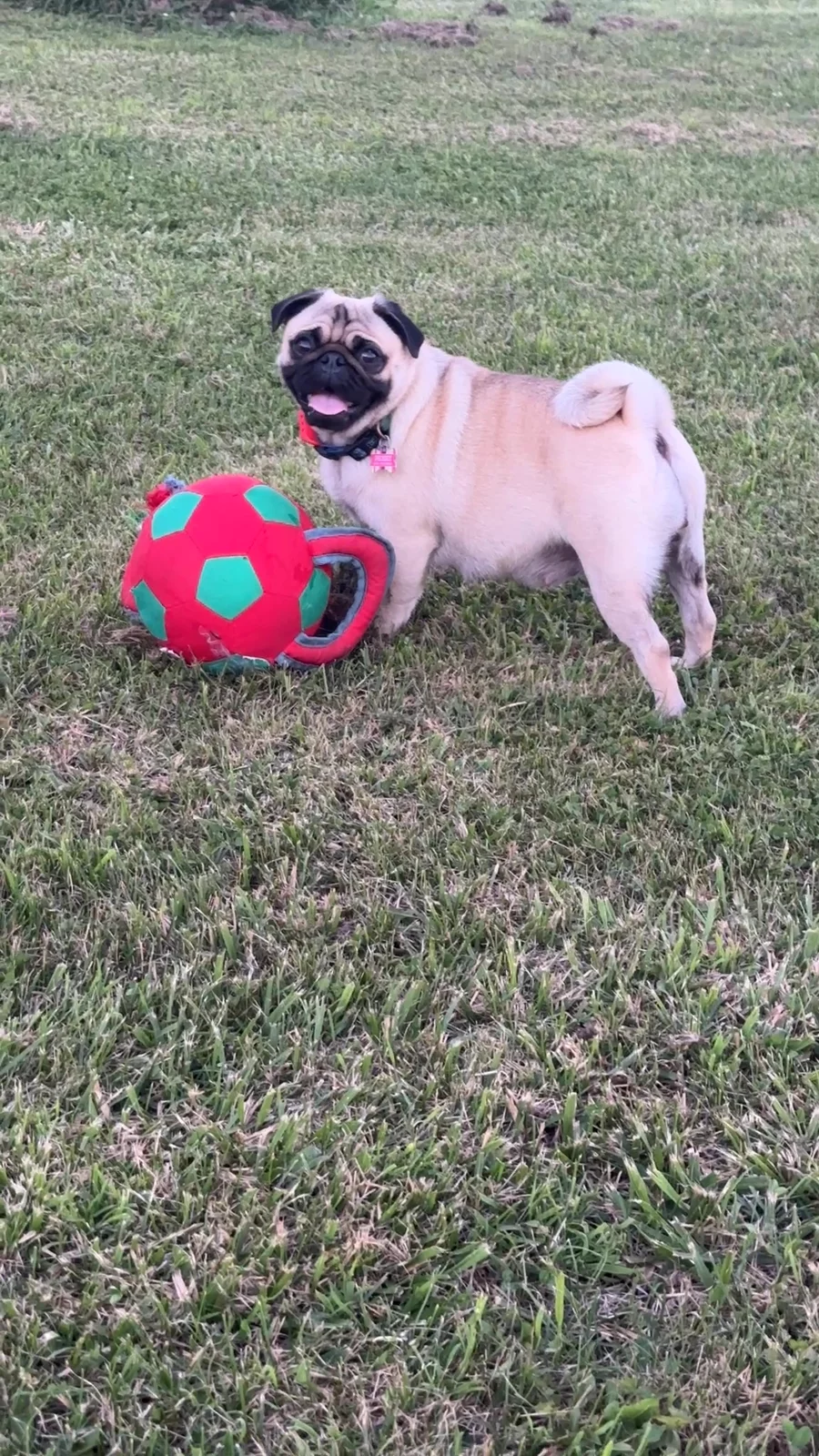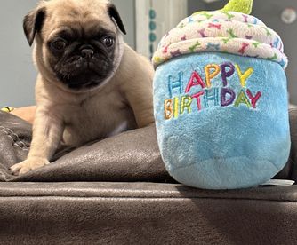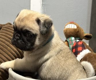 Phoenix is very playful. She loves to play with her toys and tries to get her friends to play with her, even when they are trying to nap. She will rub the stuffed animal in their faces until they have no choice but to play. She fetches at least five of her stuffies to sleep with every night. She cannot start her day without a belly rub. If I stop, she will gently nudge or grab my hand and pull it back down to her stomach. She has a very cute pug face… one that you can’t ignore. True puppy dog eyes!