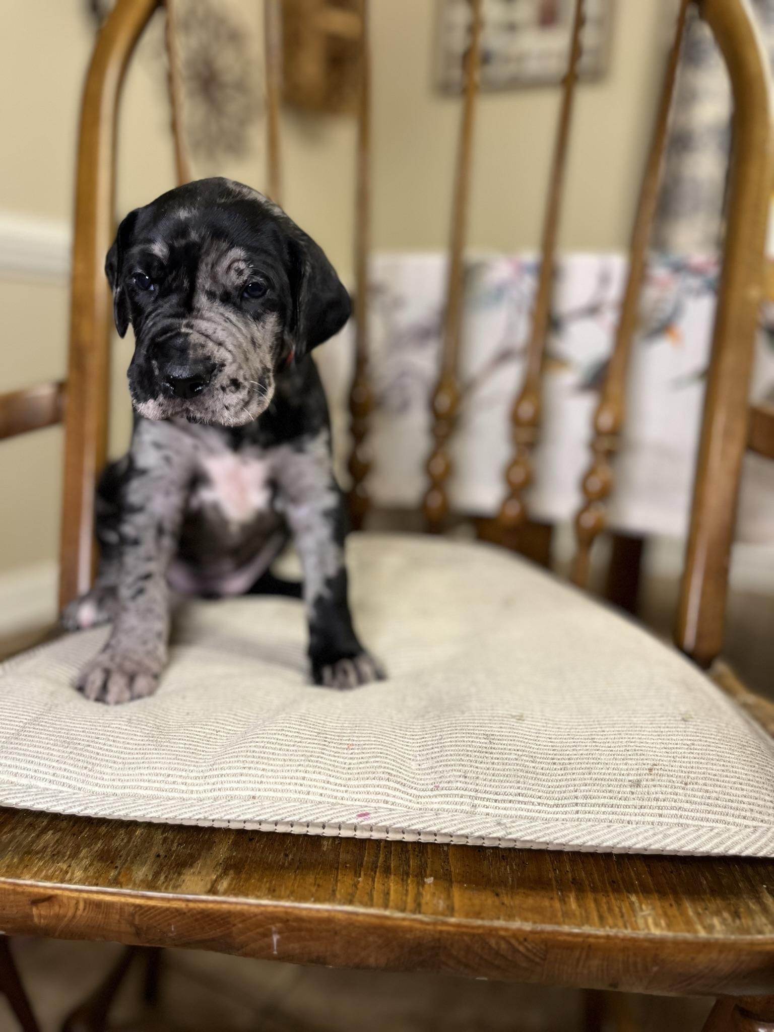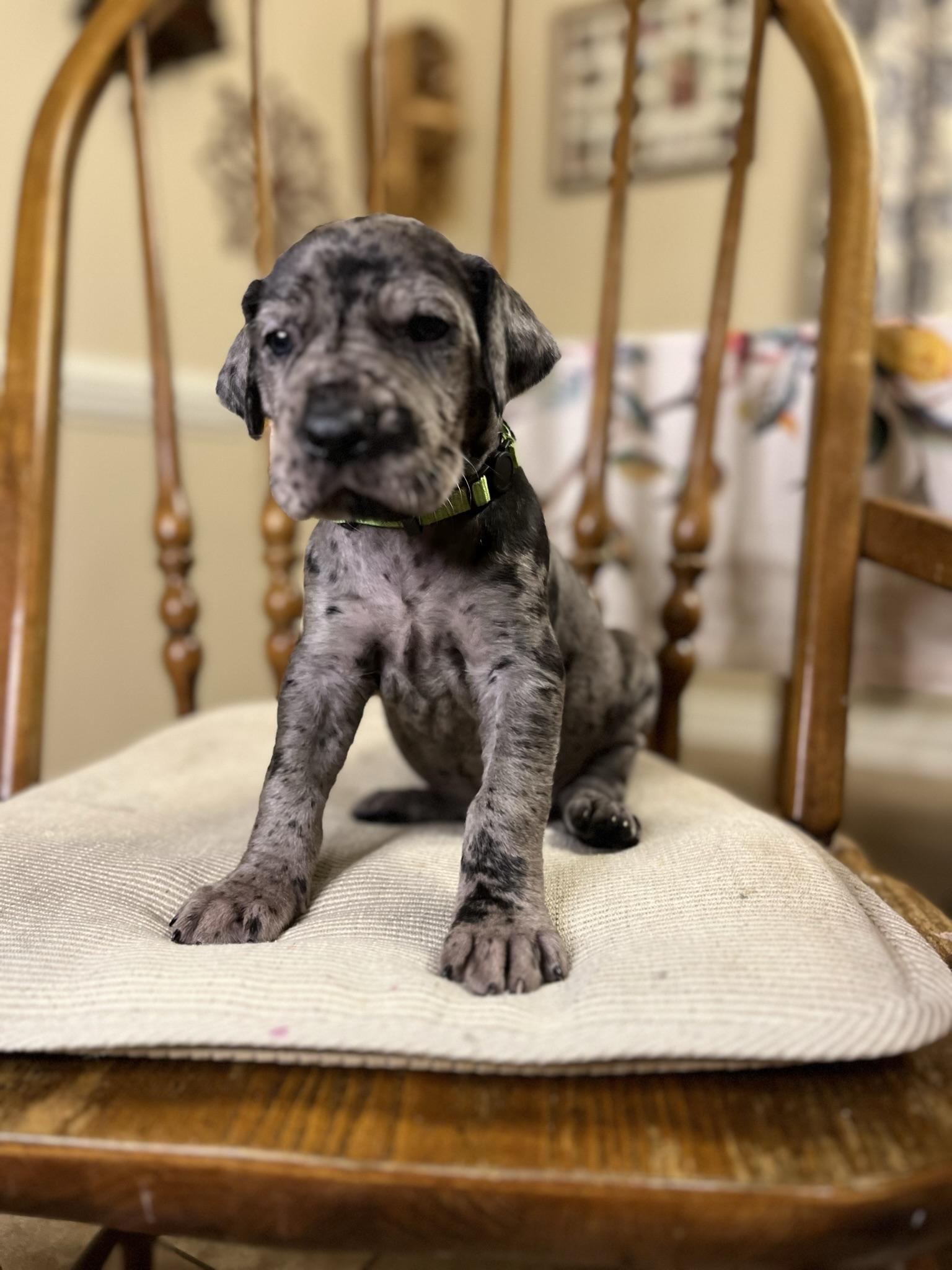 Our puppies include blue, harlequin, merle, and black. Colors will vary depending on the parent dogs.