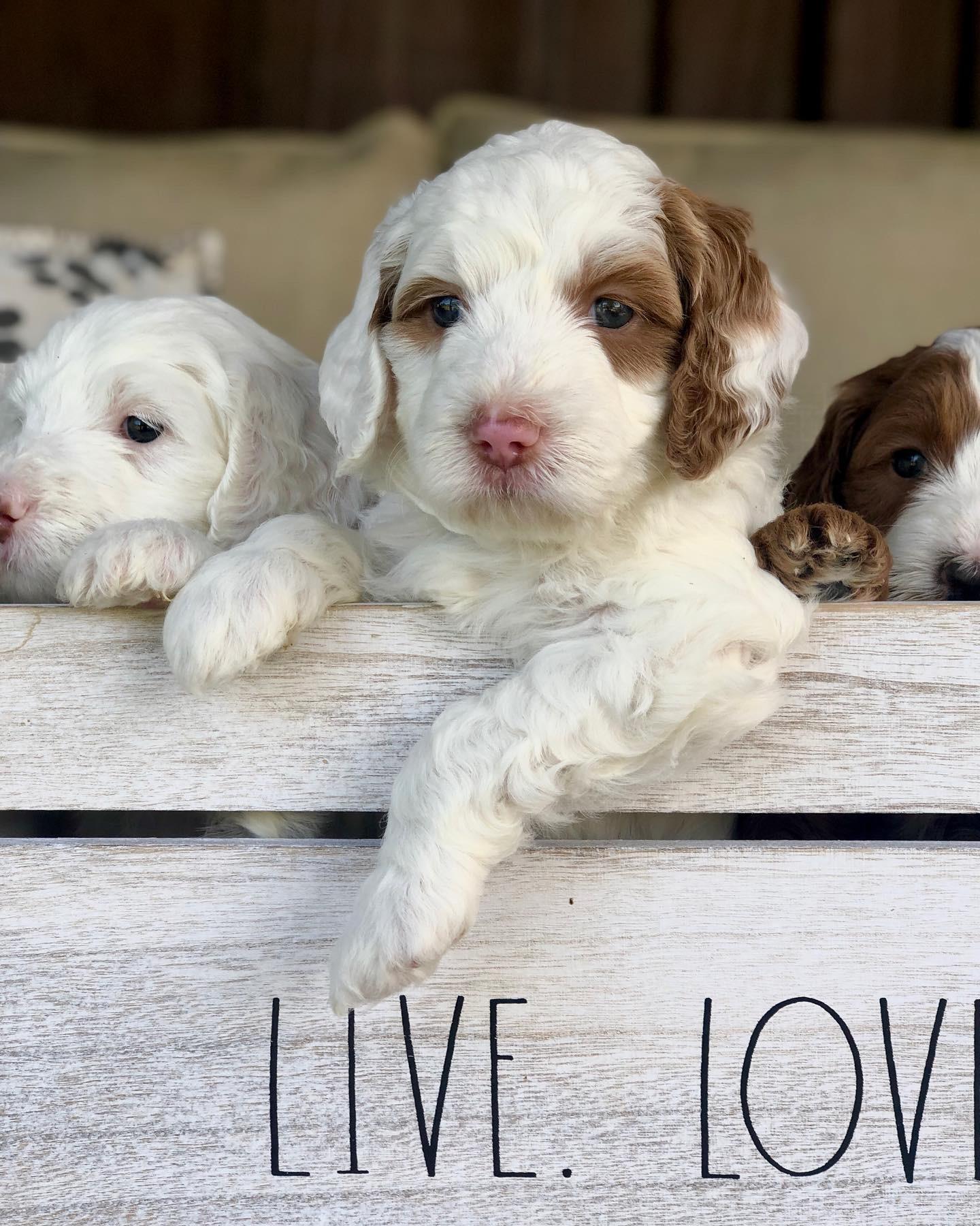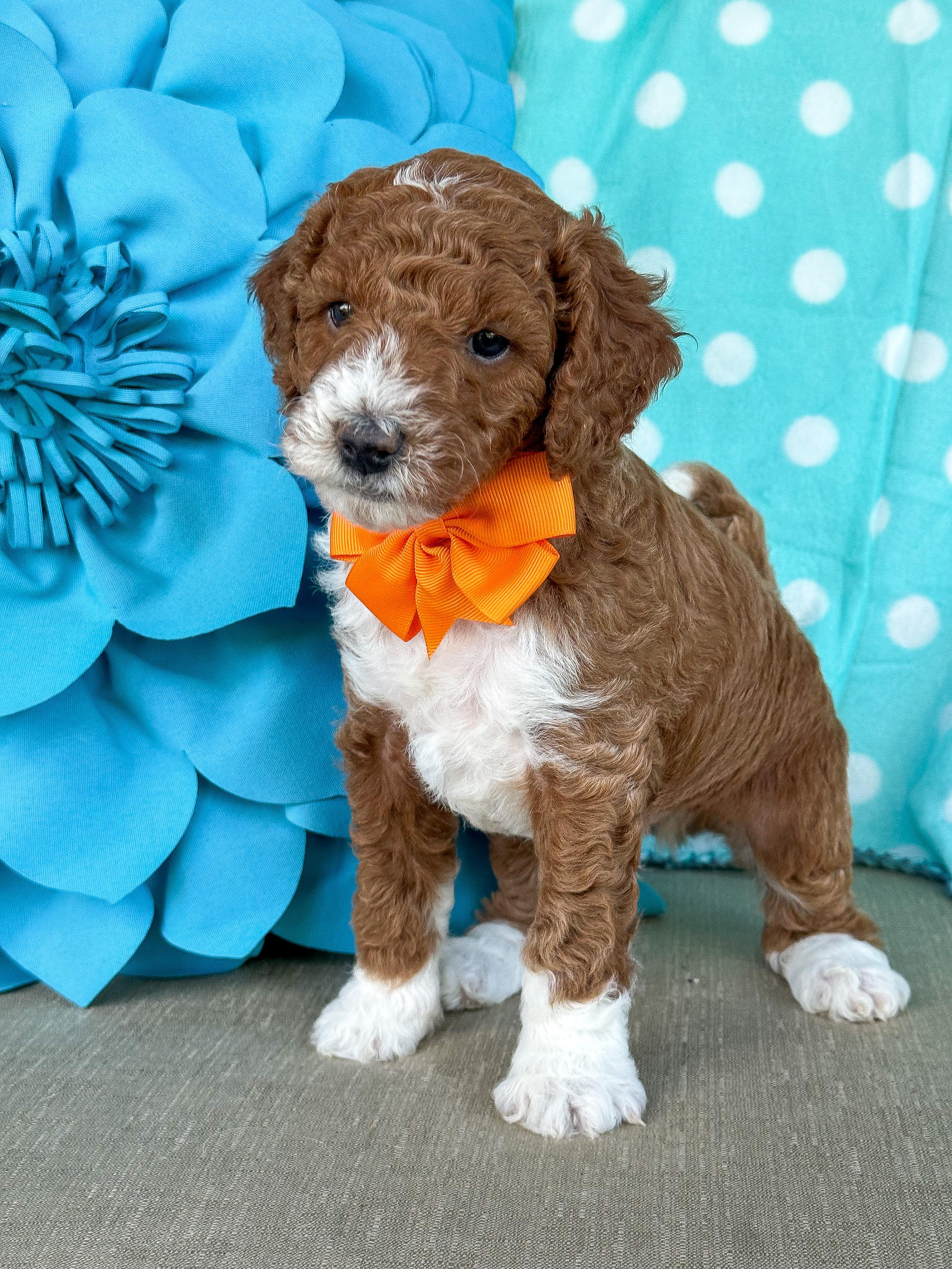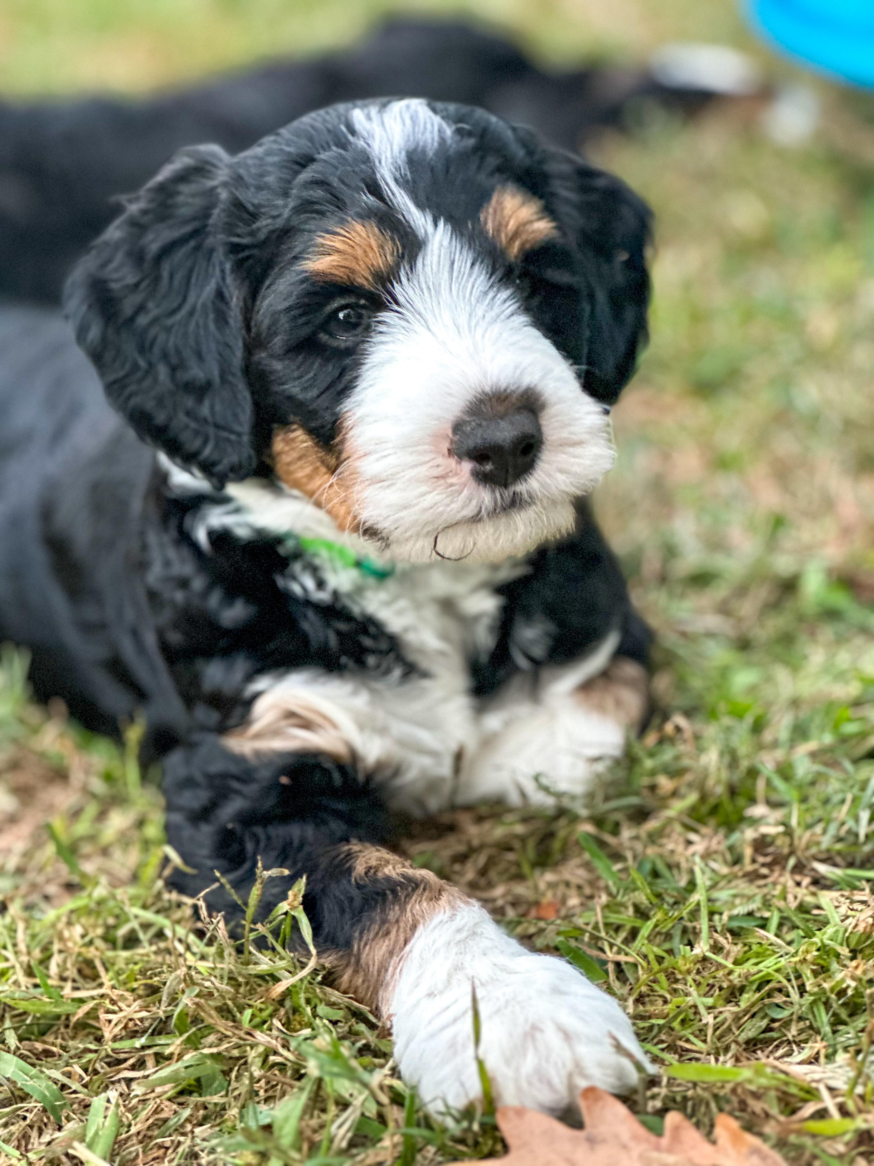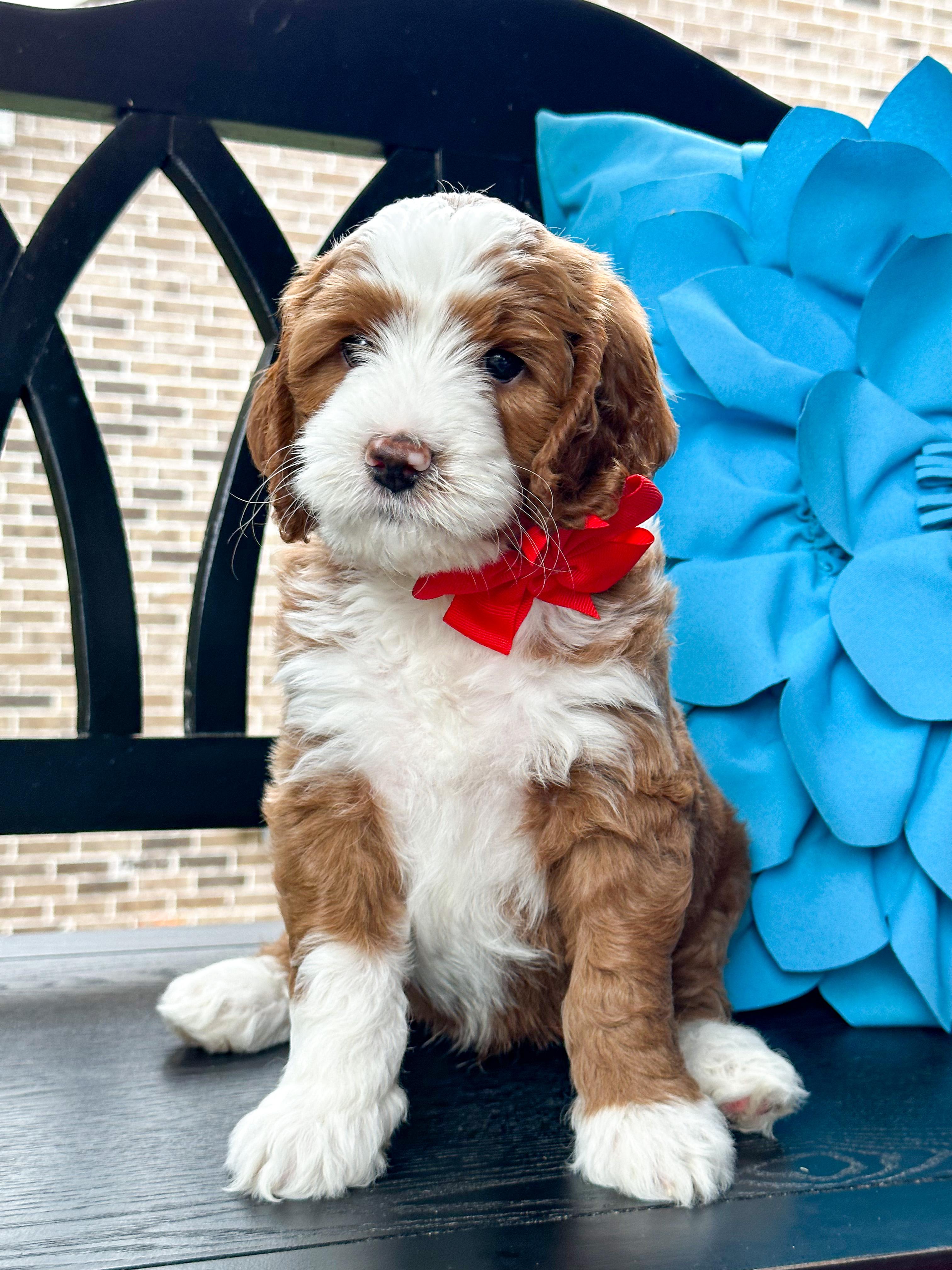 Our Bernedoodle puppies include tri-color, phantom, and merle. Goldendoodle puppies include apricot, red, chocolate, and parti. Colors will vary depending on the parent dogs.