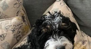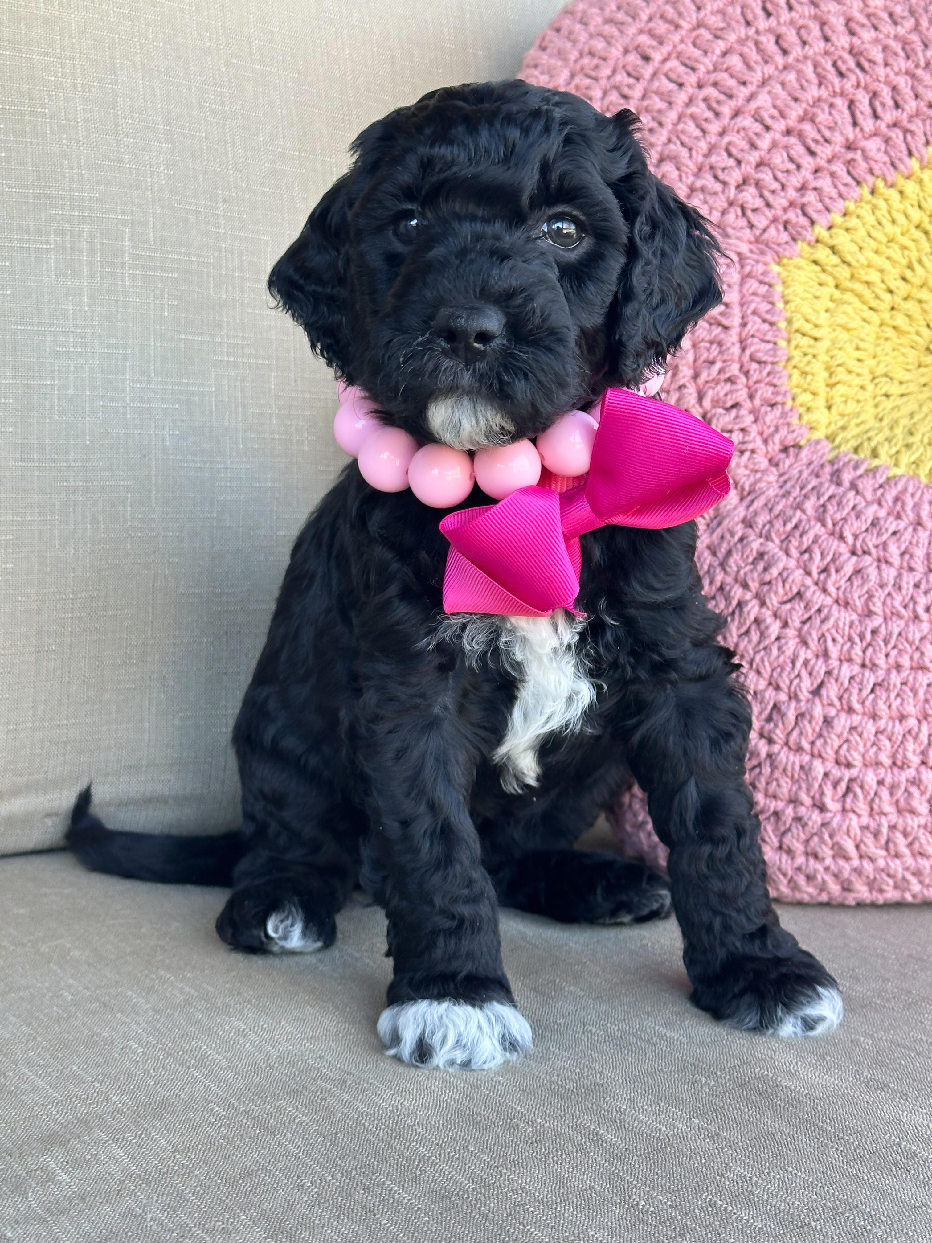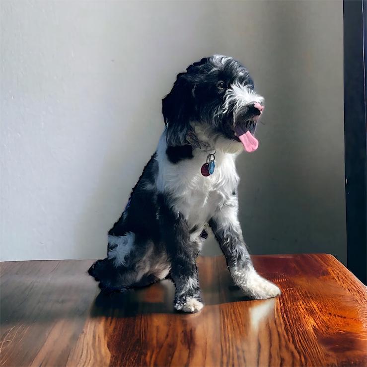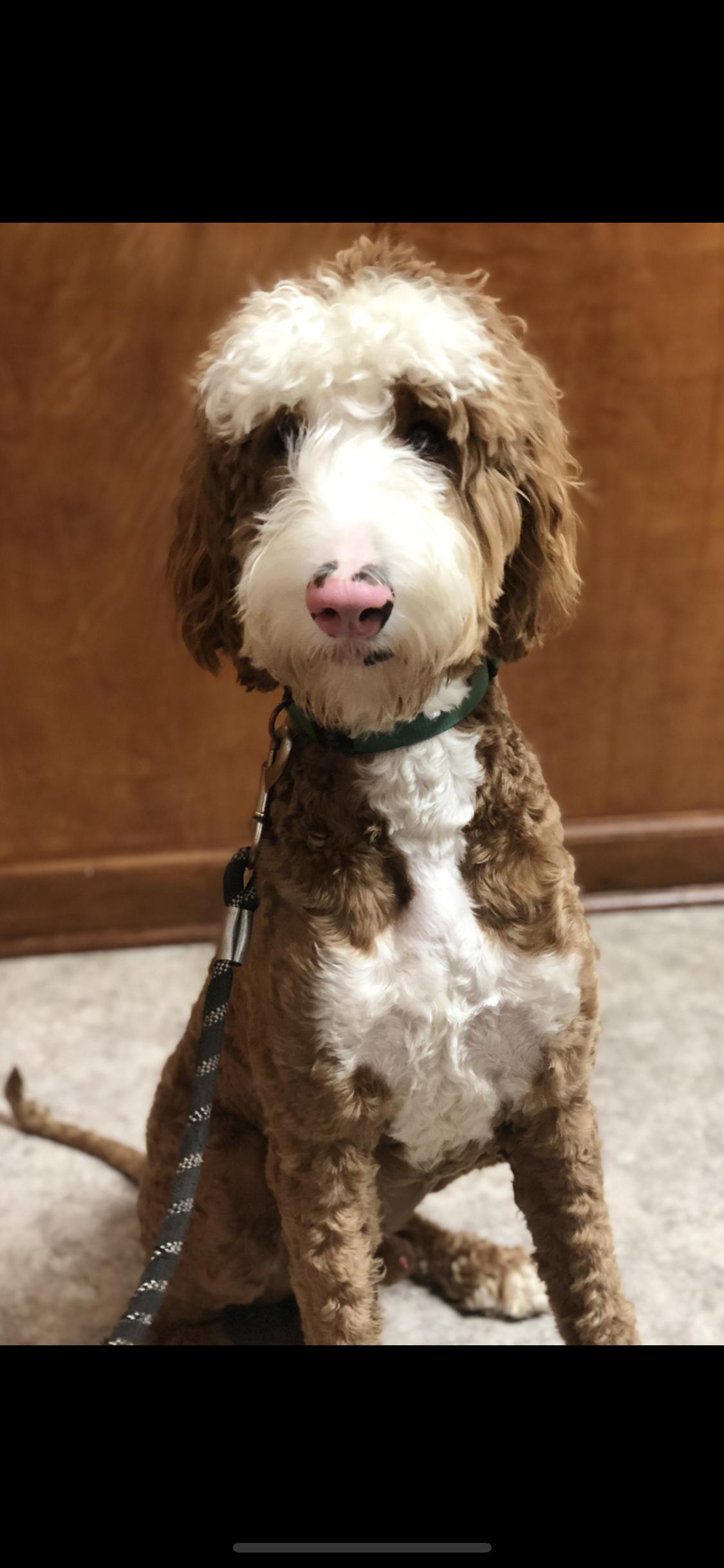 Poppy is a tuxedo multigenerational Goldendoodle is a non-shedding straight-wavy (-/-) coat. She has had OFA and genetic health testing. She is incredibly sweet, quiet, and calm. She can be sneaky though and will chew on socks or trash, lol.