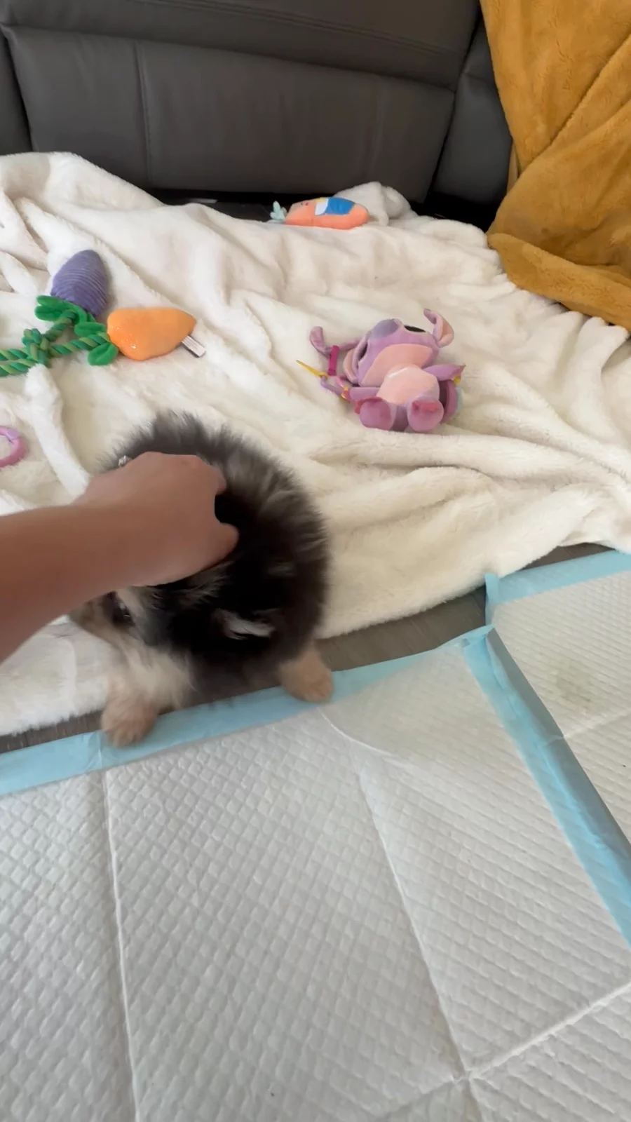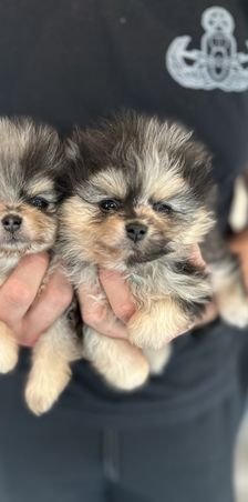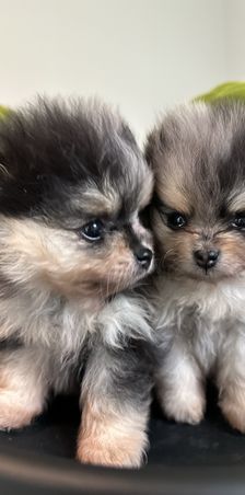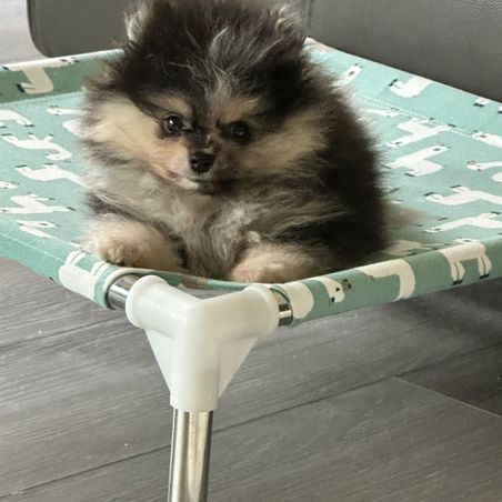 Meet Ollie, our adorable little princess! Weighing in at just 4 lbs, this tiny, short and stubby beauty is a stunning black and tan merle Pomeranian. With her captivating coat and sparkling eyes, she’s impossible to resist. But don’t let her small size fool you—Ollie is incredibly intelligent and loyal, always ready to keep you company. She has a heart full of love and a penchant for lounging around, cuddling up next to you for some well-deserved snuggle time. Whether she’s showing off her sweet personality or simply relaxing in your arms, Ollie is the perfect companion and we hope her future babies are just like her- a loving and loyal friend.