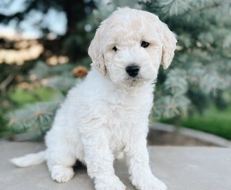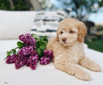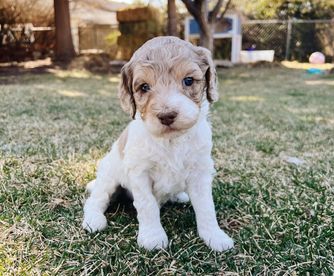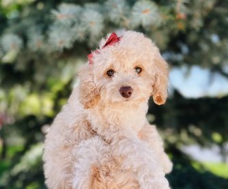 Nova is a super sweet loving girl, she is a F1 English cream golden doodle. She has more of the English cream retriever confirmation to her making her a very lovely bigger boned girl with a gentle laid back temperament and lovely with kids and other animals. She is very smart and is an excellent mother!