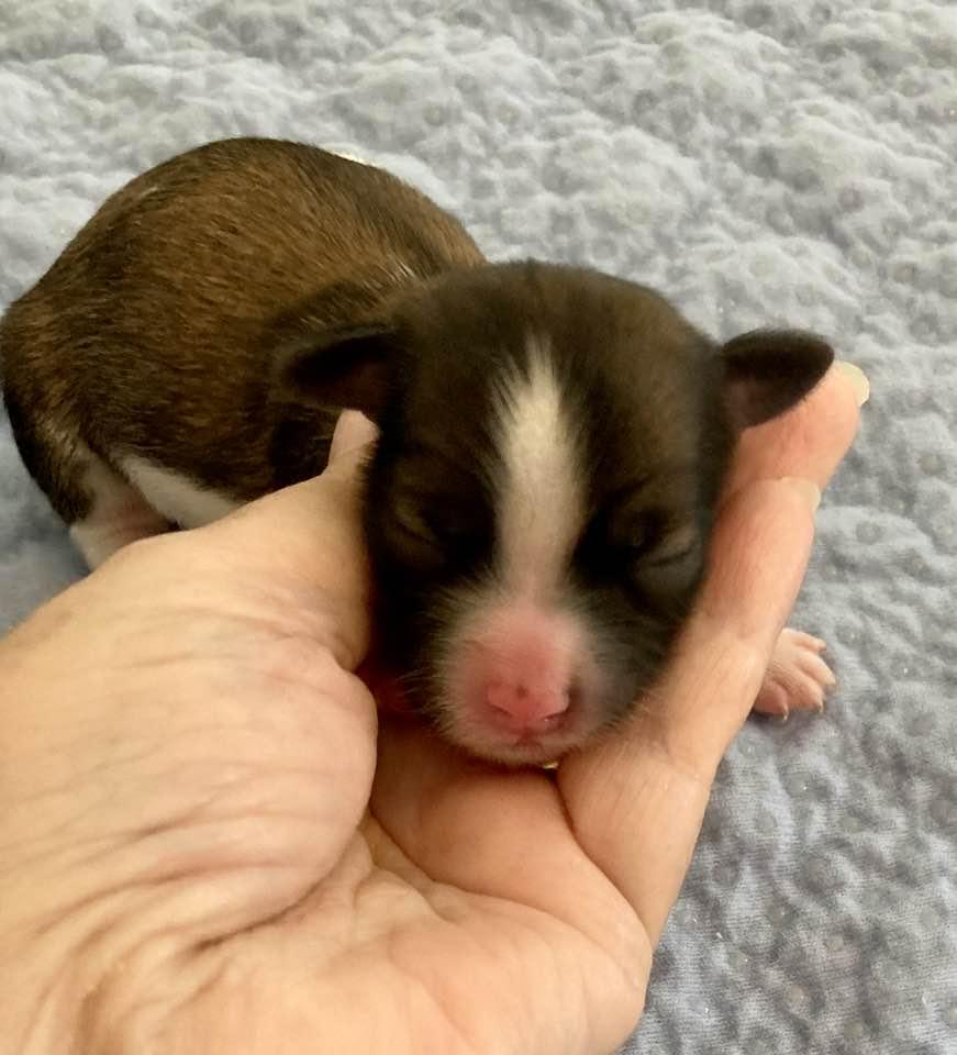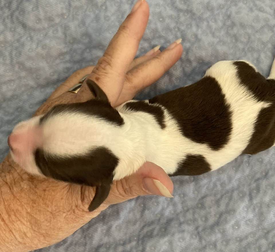 Rikki is a dark chocolate with white markings. His confirmation is outstanding. He is a happy and loving boy.